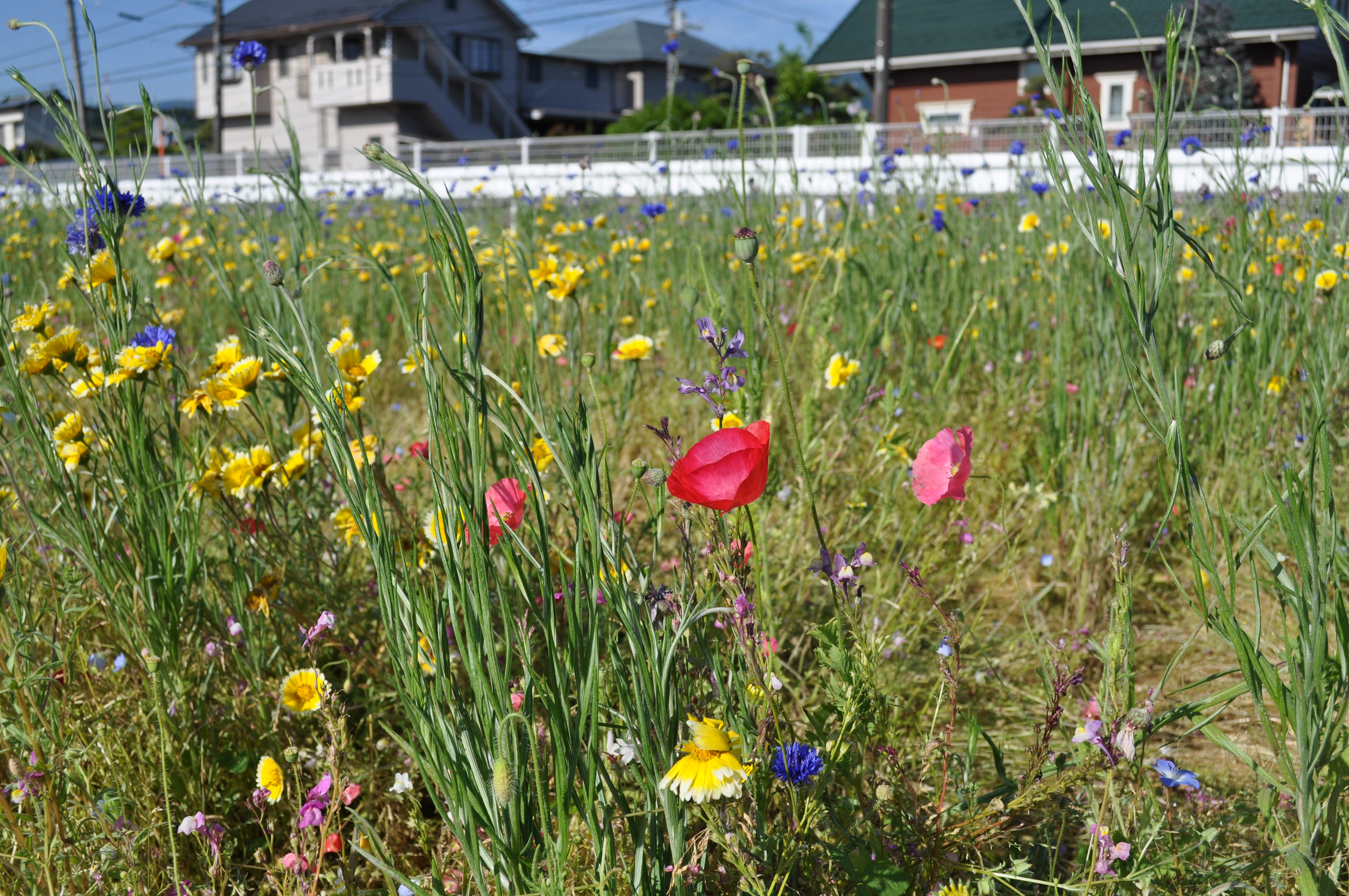 矢車草や色とりどりのポピーが風に揺られて
