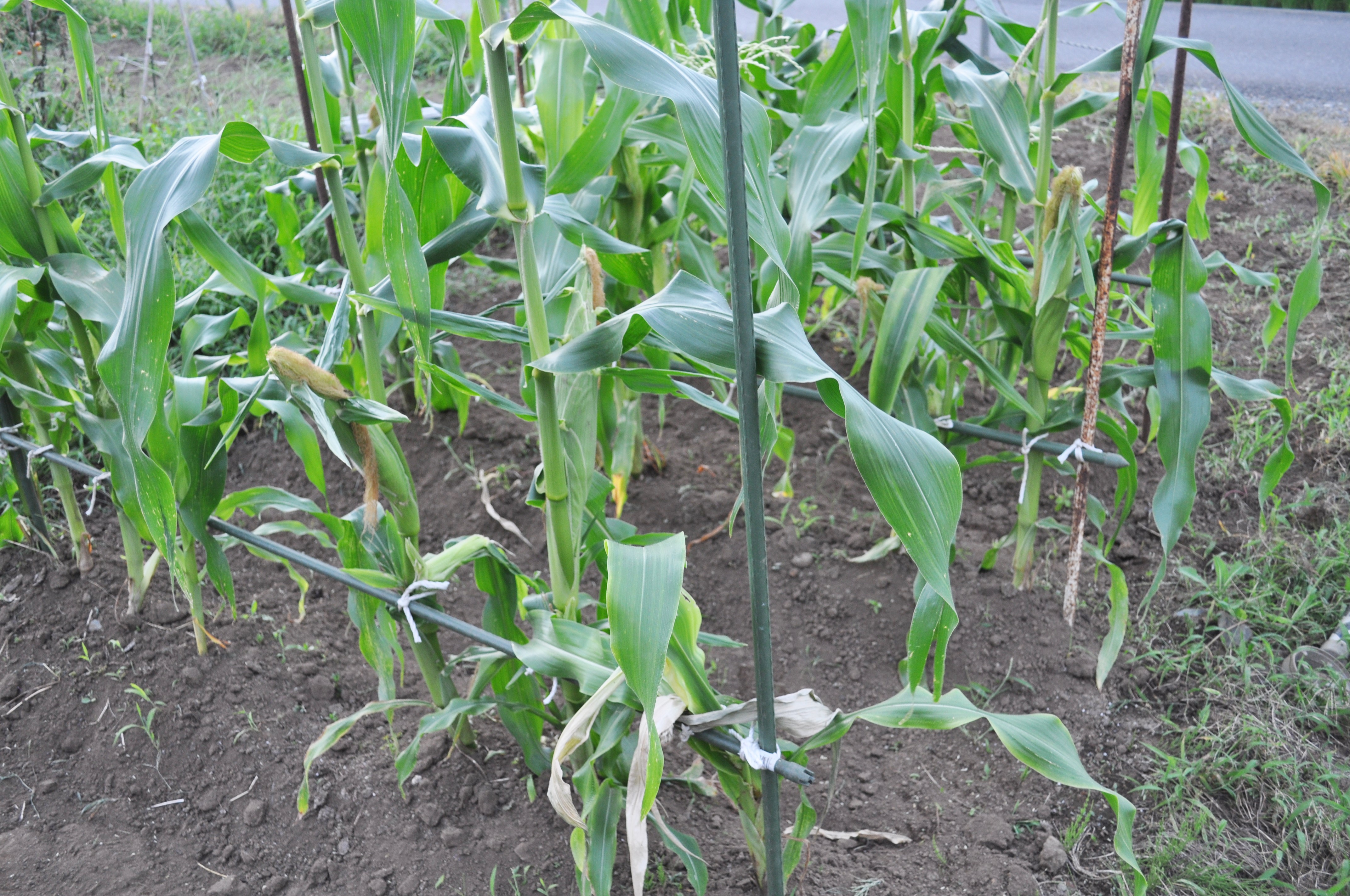 支柱で支えてやったら、根元がスッキリして草がむしりやすくなりました。