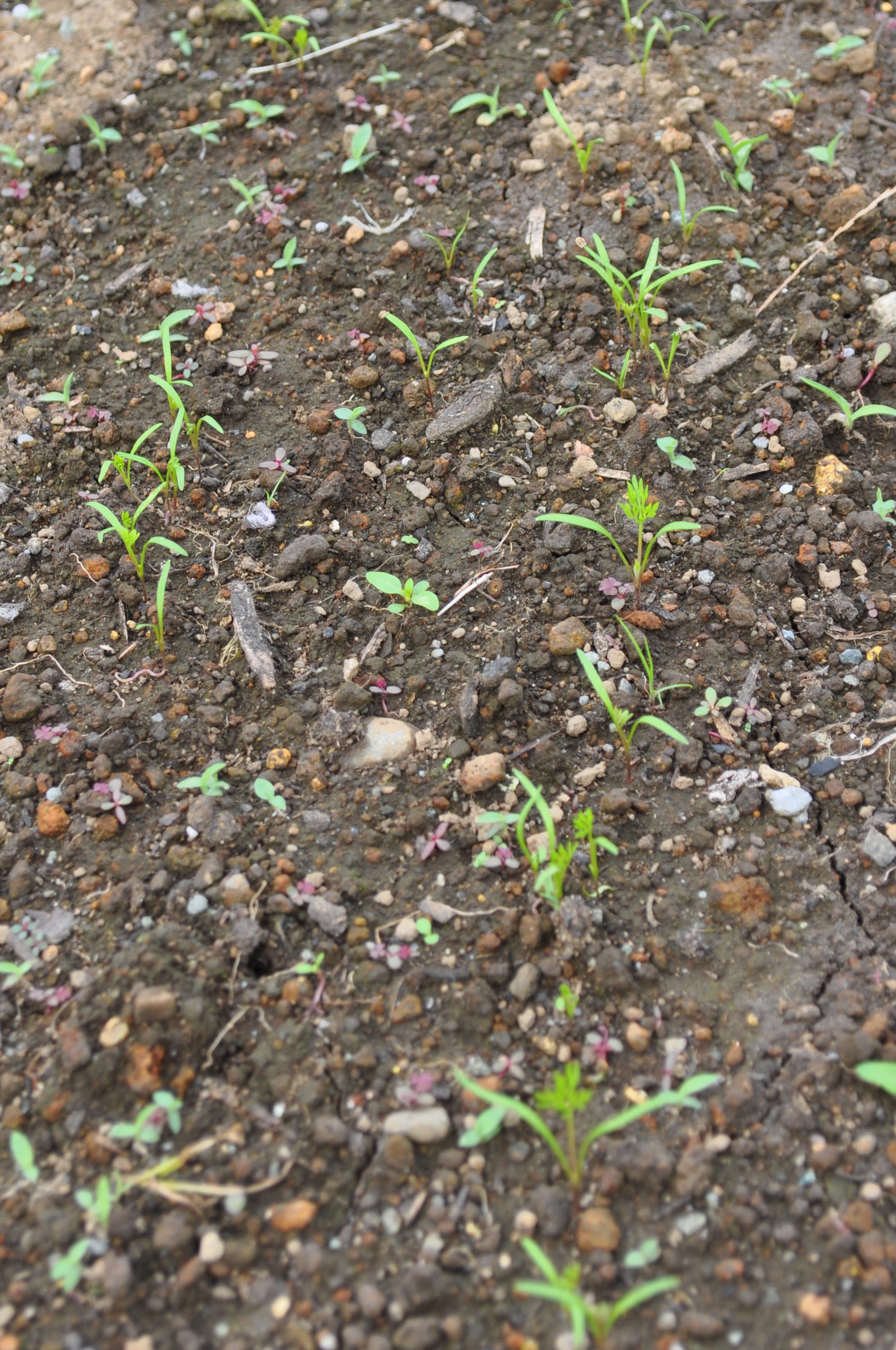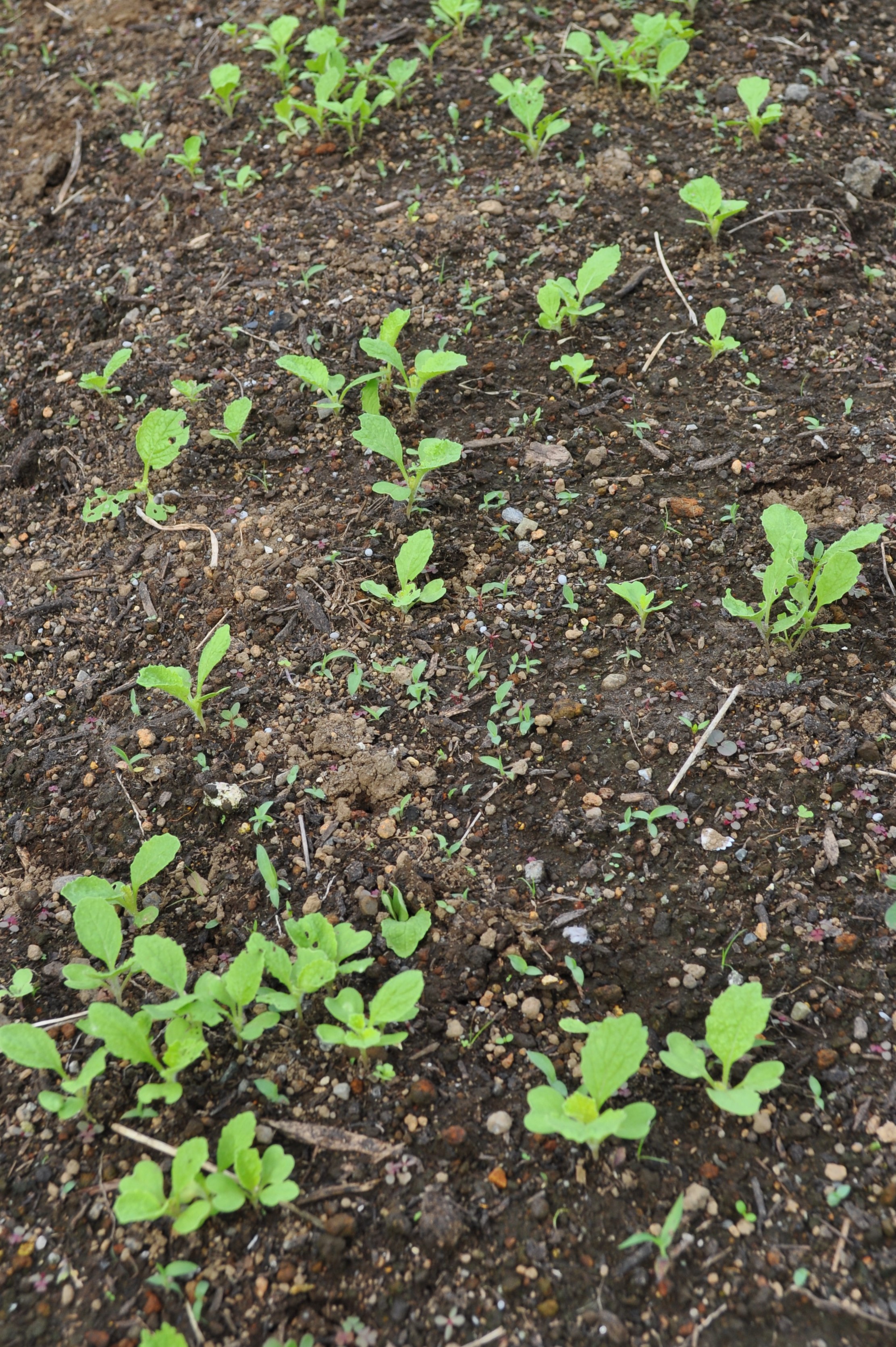 別の畑では、先々週、雨の中蒔いた(野菜の)種から