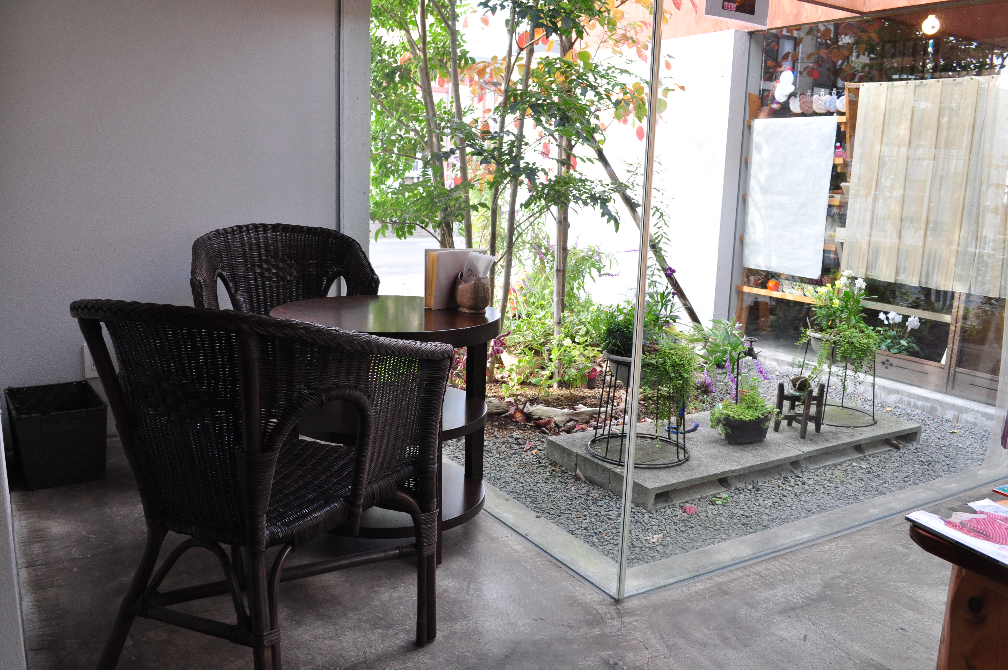 小上がり横の一角に2脚の籐椅子とローテーブル。
