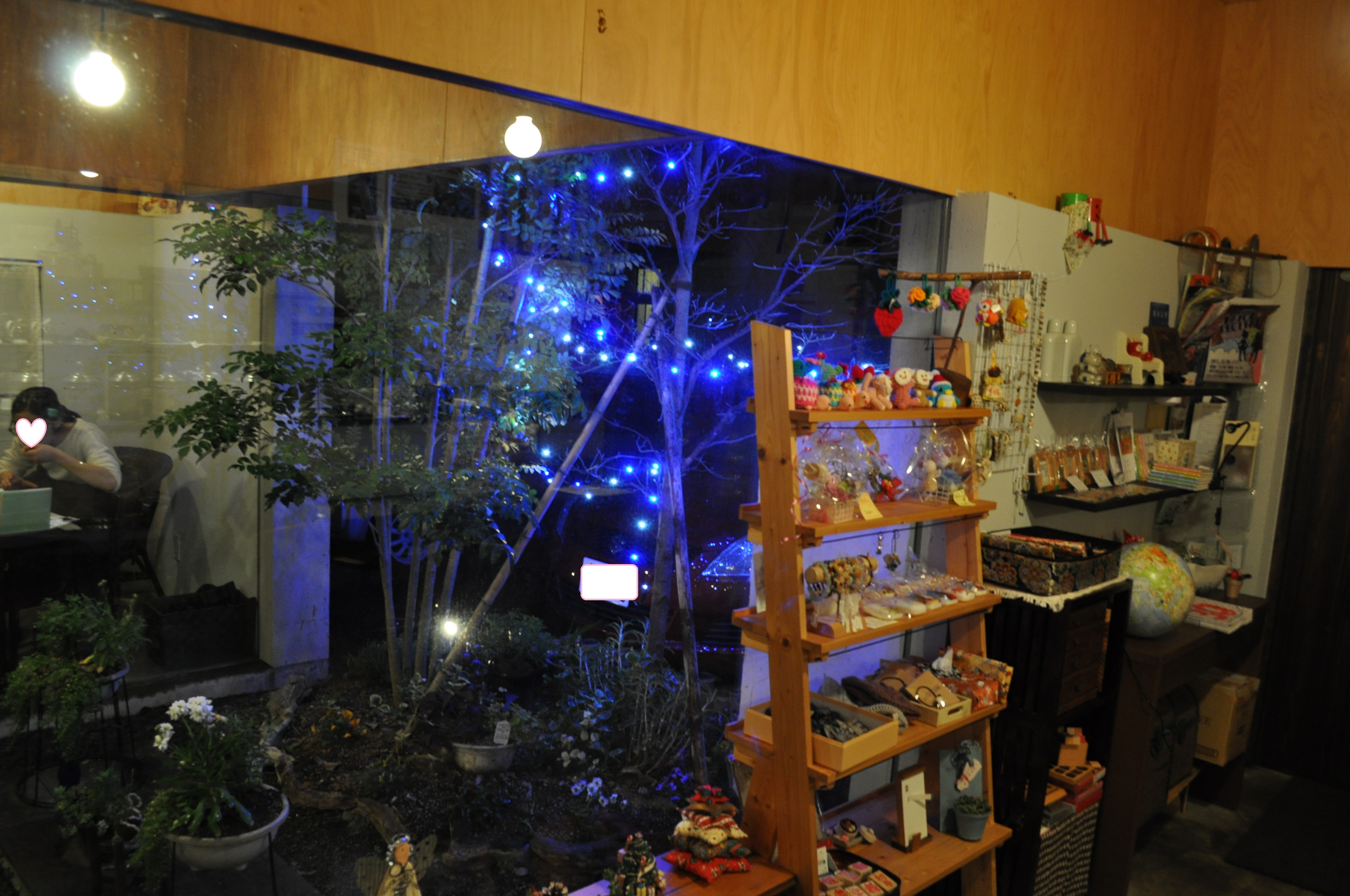 店内のガラスに複雑に反射して