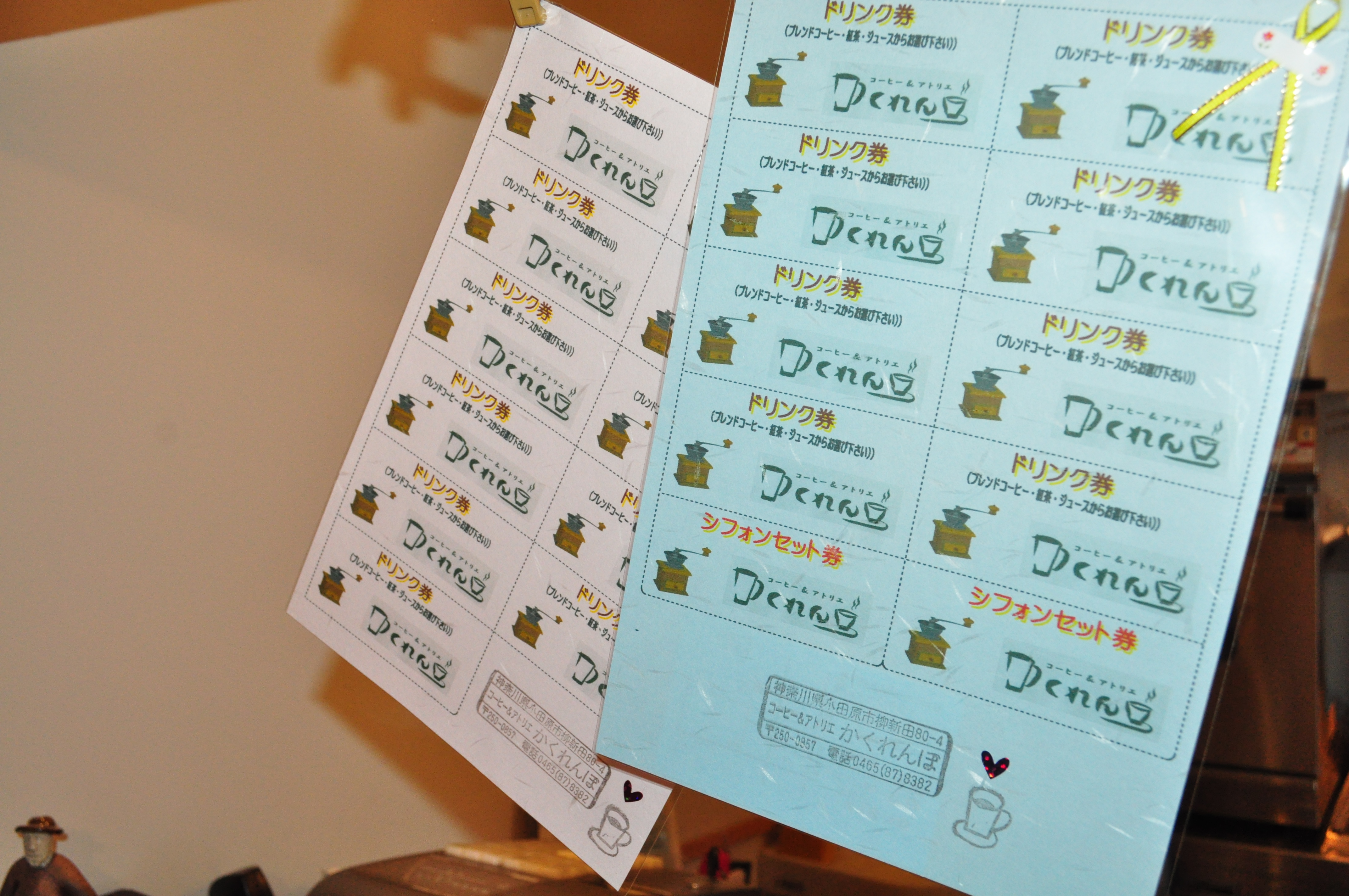 ピンクのチケットは、コーヒー券11枚綴りで一杯分500円お得。
