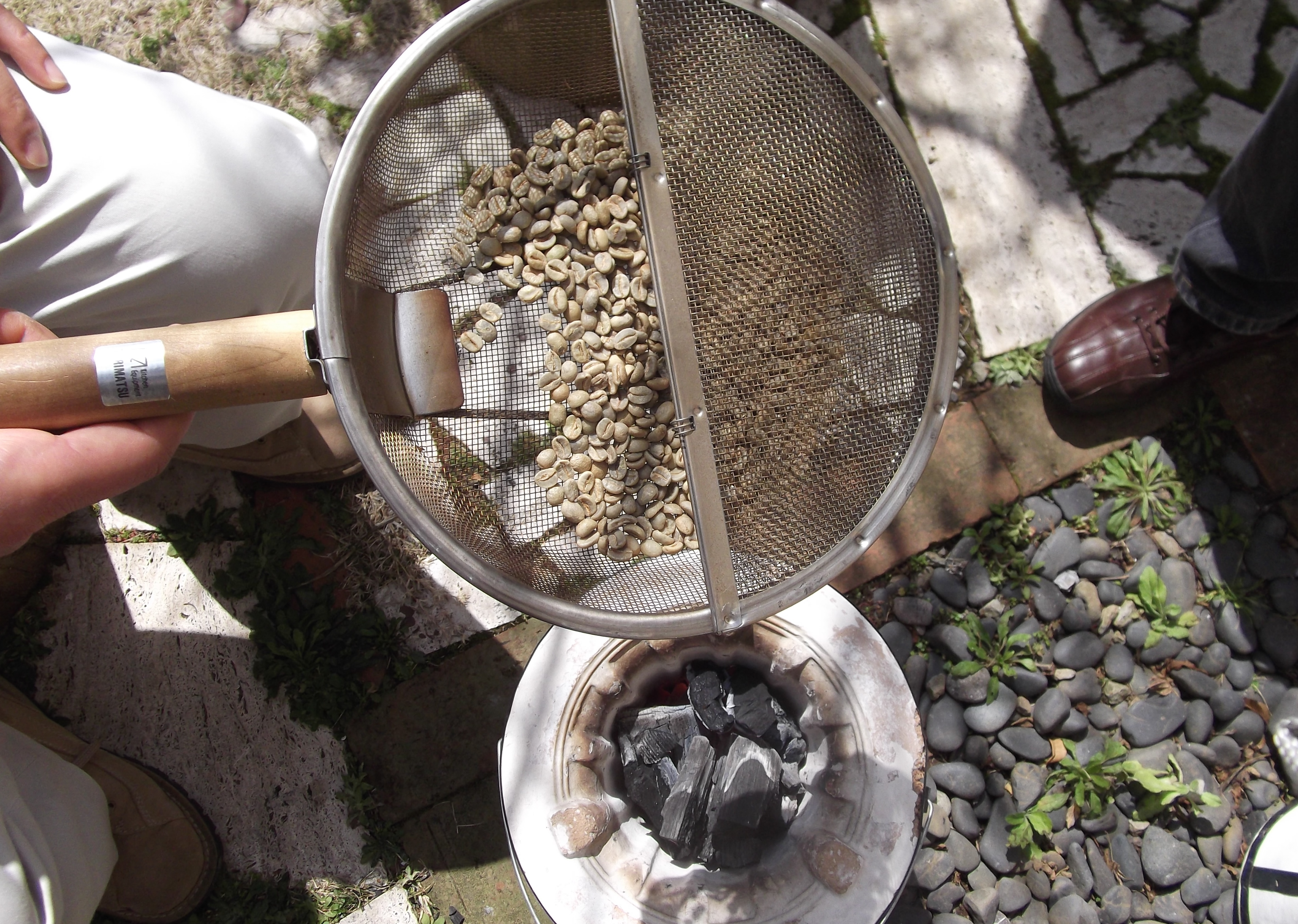 ①うすい緑色をした生豆を120gほど、手網(ぎんなん用?)の中に入れます。