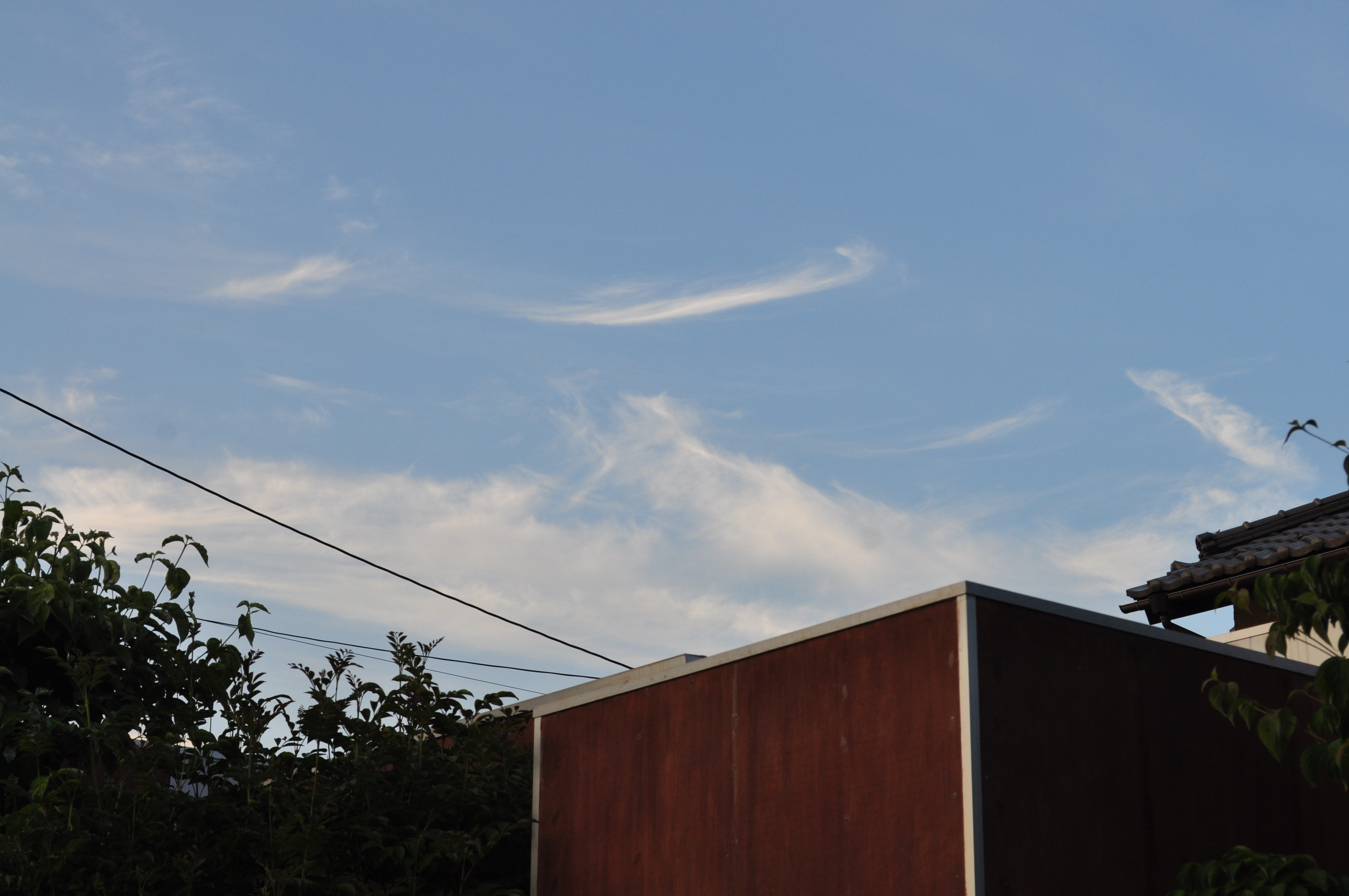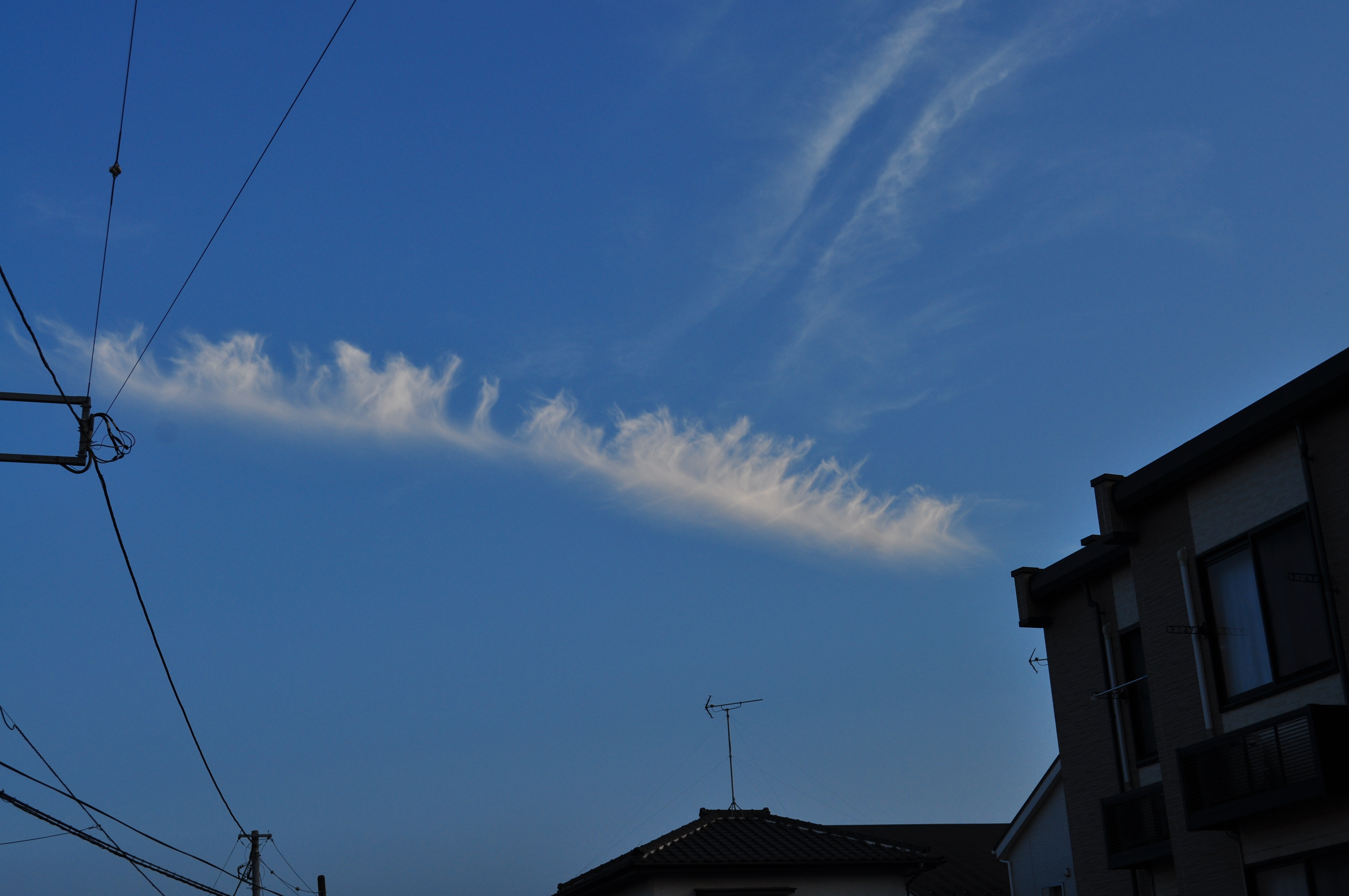 私もつられて仰ぎ見ると、みごとな飛行機雲が。
