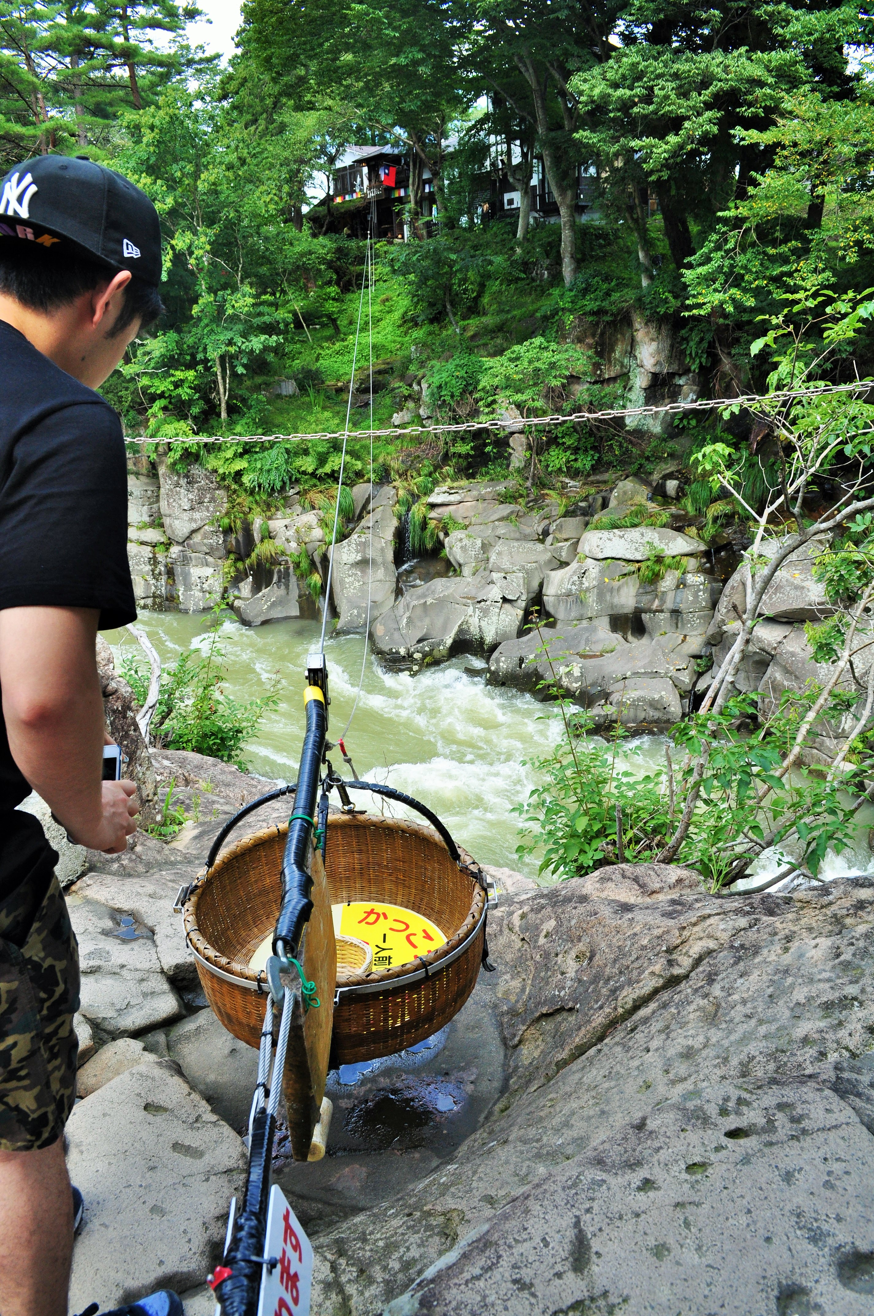 川岸にあるお店から川を渡って『空飛ぶ』も、そばでしっかり見学。