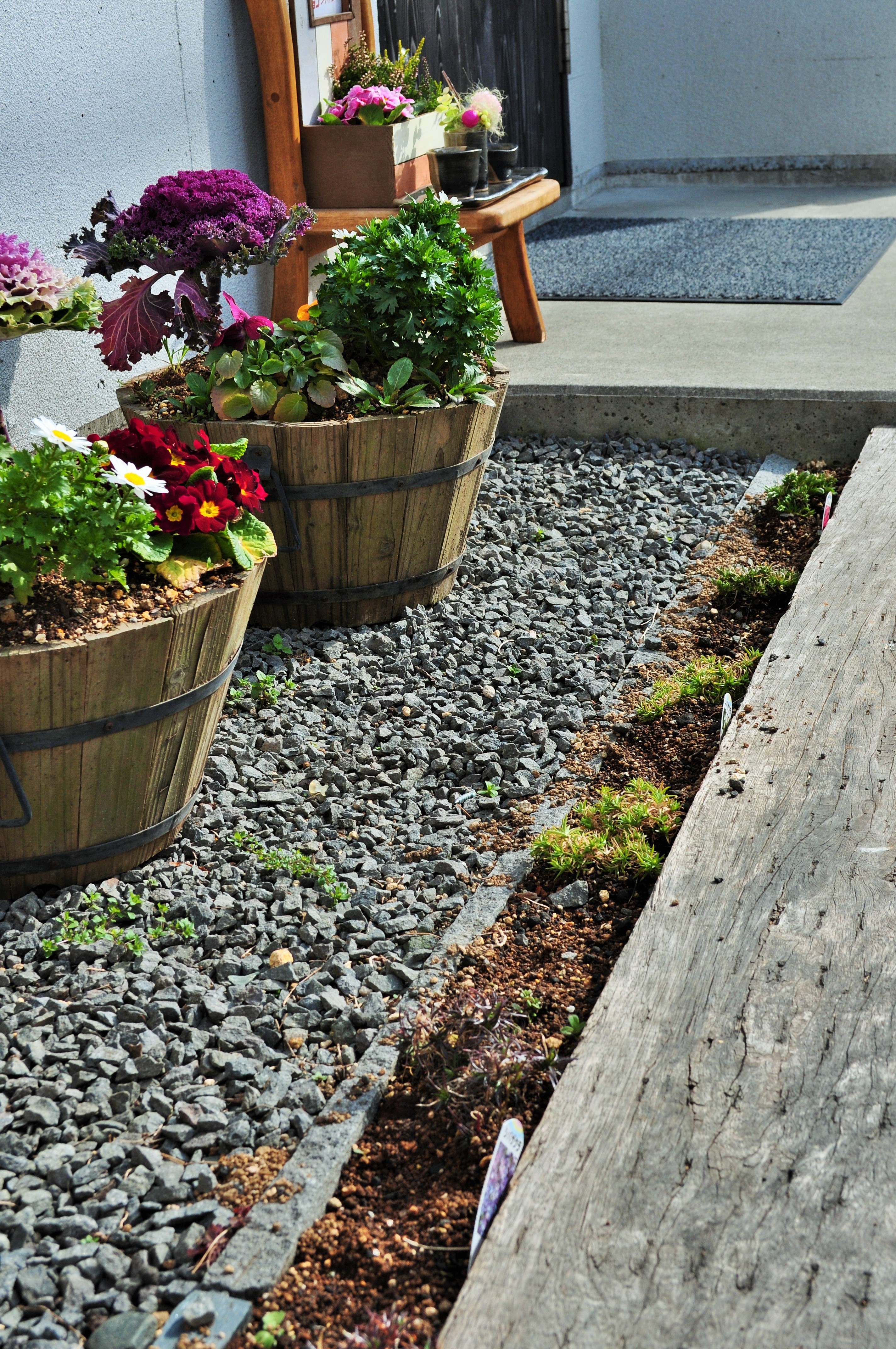 (玄関ドアに続く枕木のアプローチにも)。