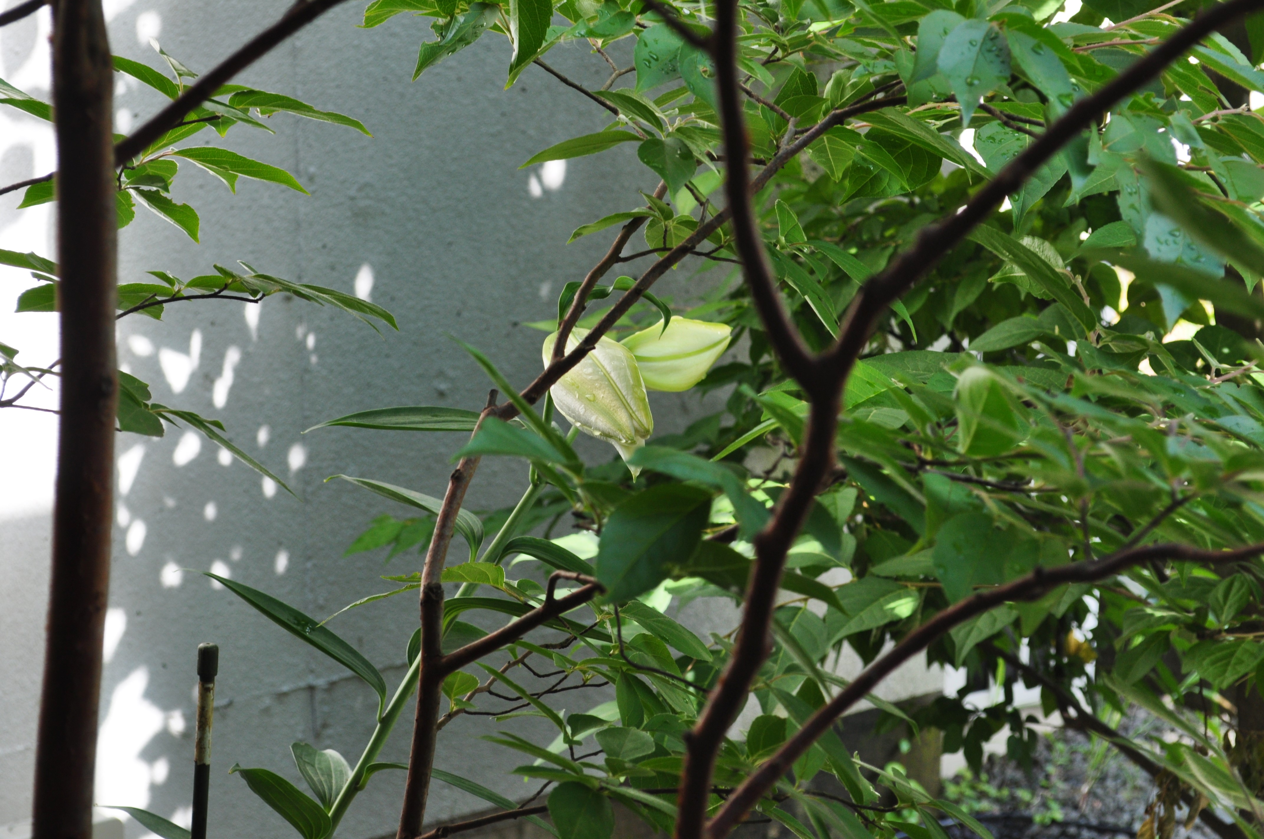 すくすく背を伸ばし、白い大きなつぼみが2つ。