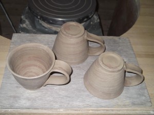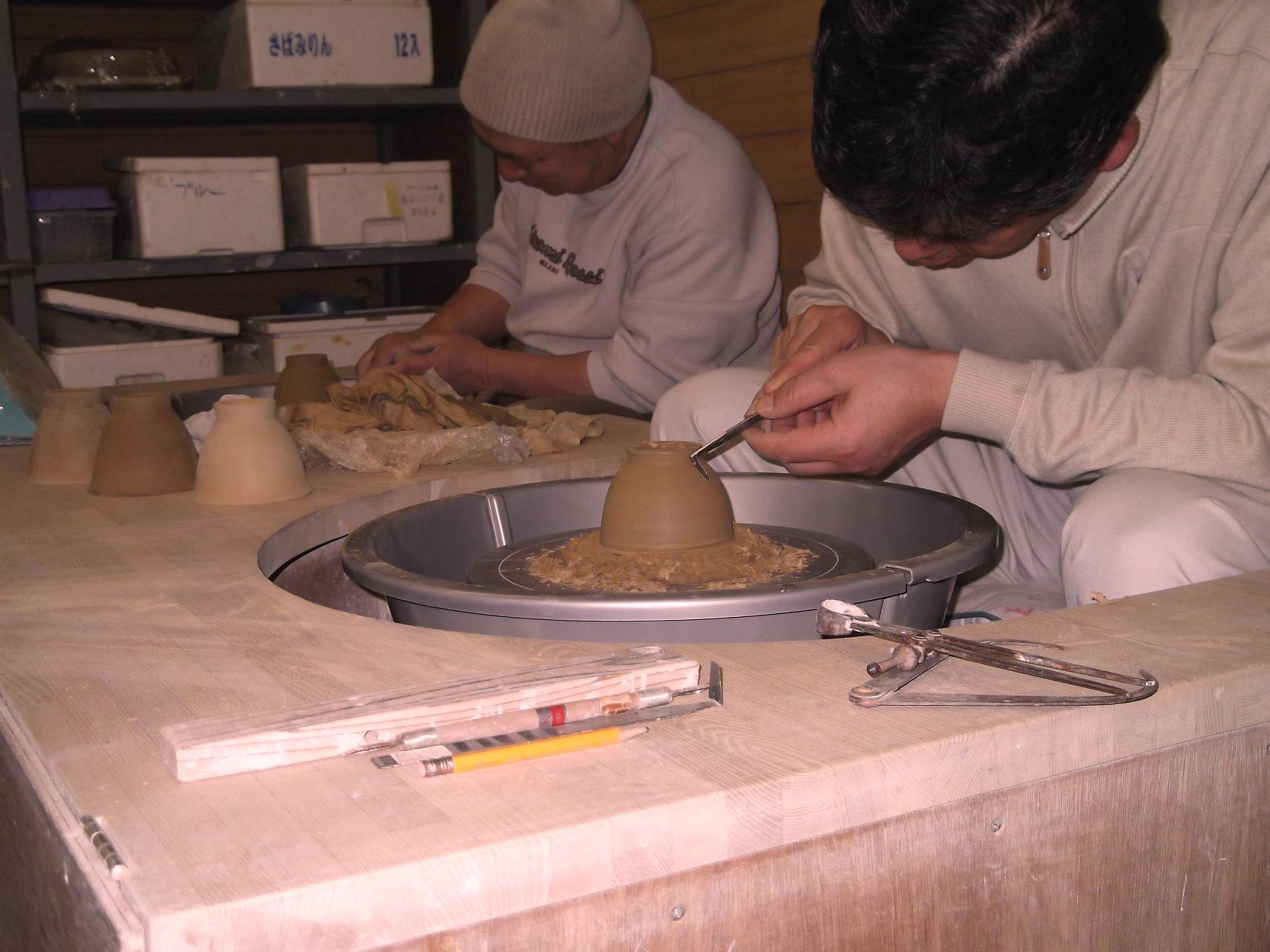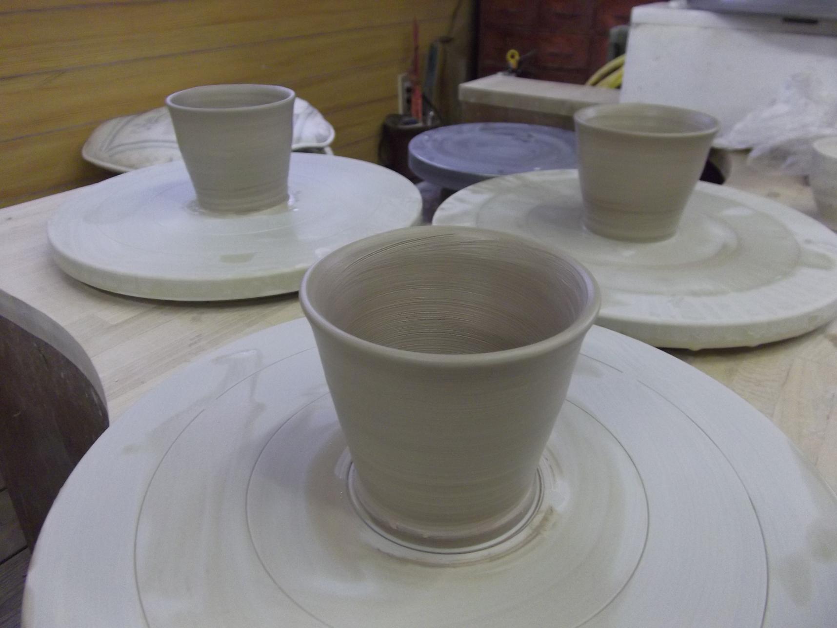 ろくろを回して、まだしっとりやわらかいカップに器具をあてると