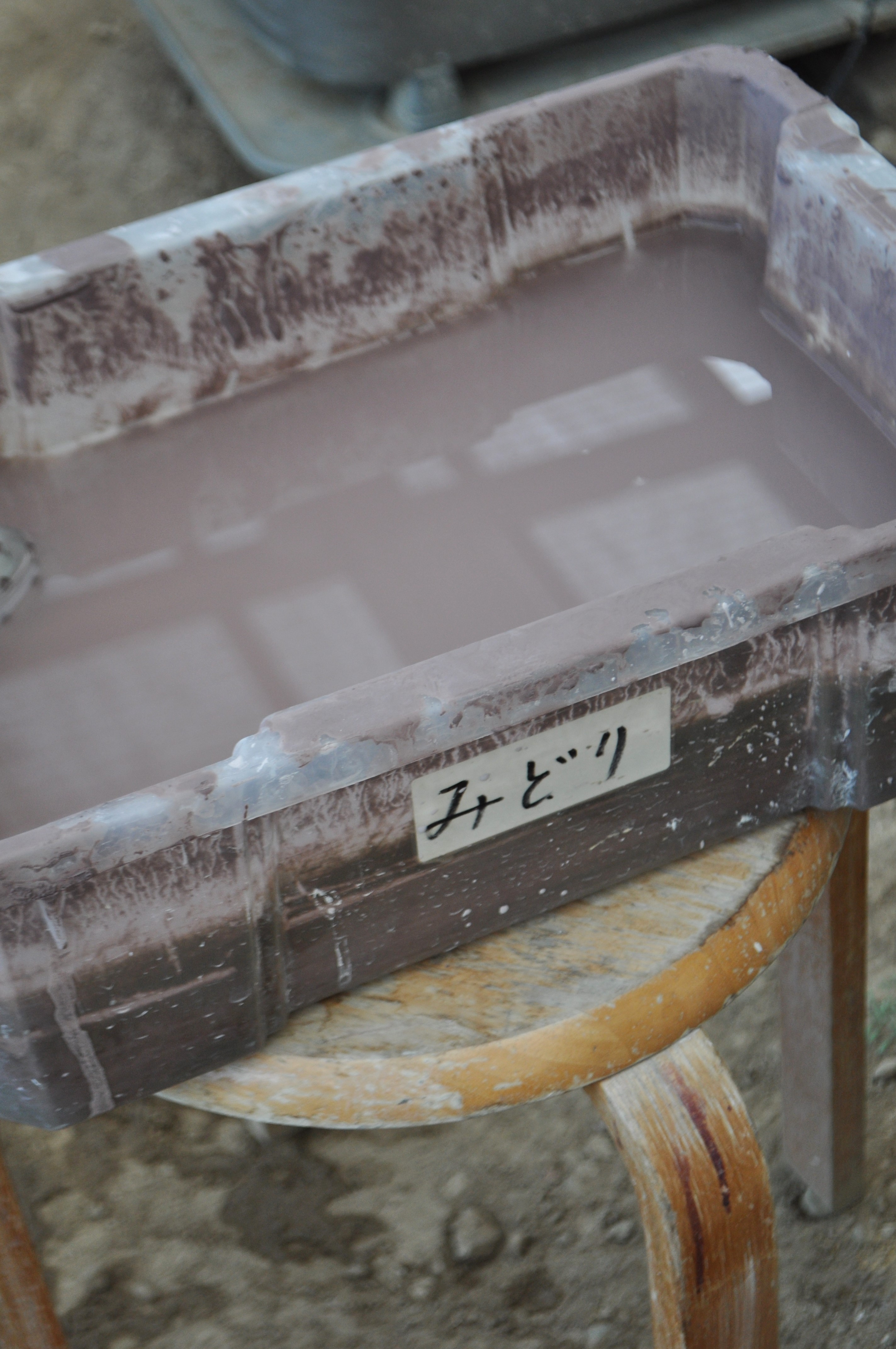 薄紫に見える釉薬が、焼きあがると淡い蒼緑に・・・。