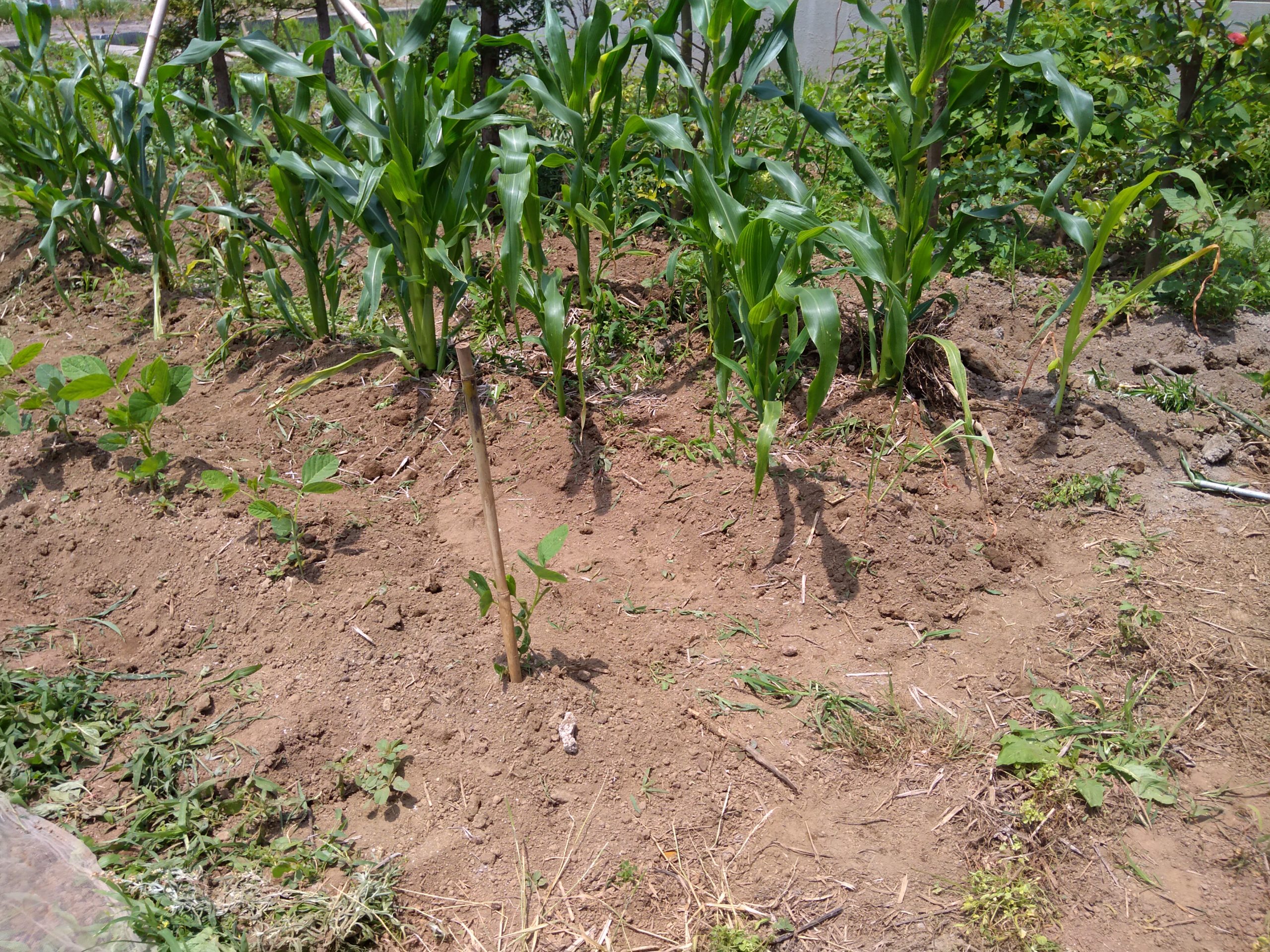 『トウモロコシ』の土寄せと周辺の草むしり、追肥。