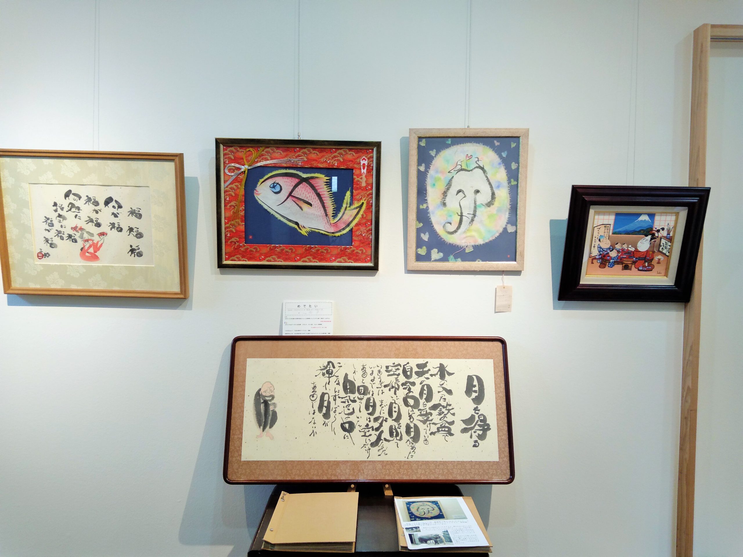 かくれ文字絵の二作品『めでたい』『ウメ子』を囲むように