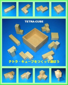 「テトラ・キューブは、小立方体4個を貼り付けてできる形8種 類を使って遊ぶパズルです。合計の体積が32ですから立方体に は組めませんが、添付画像のように、易しい問題から難しい問 題まで、いろいろな形づくりを楽しめます。」