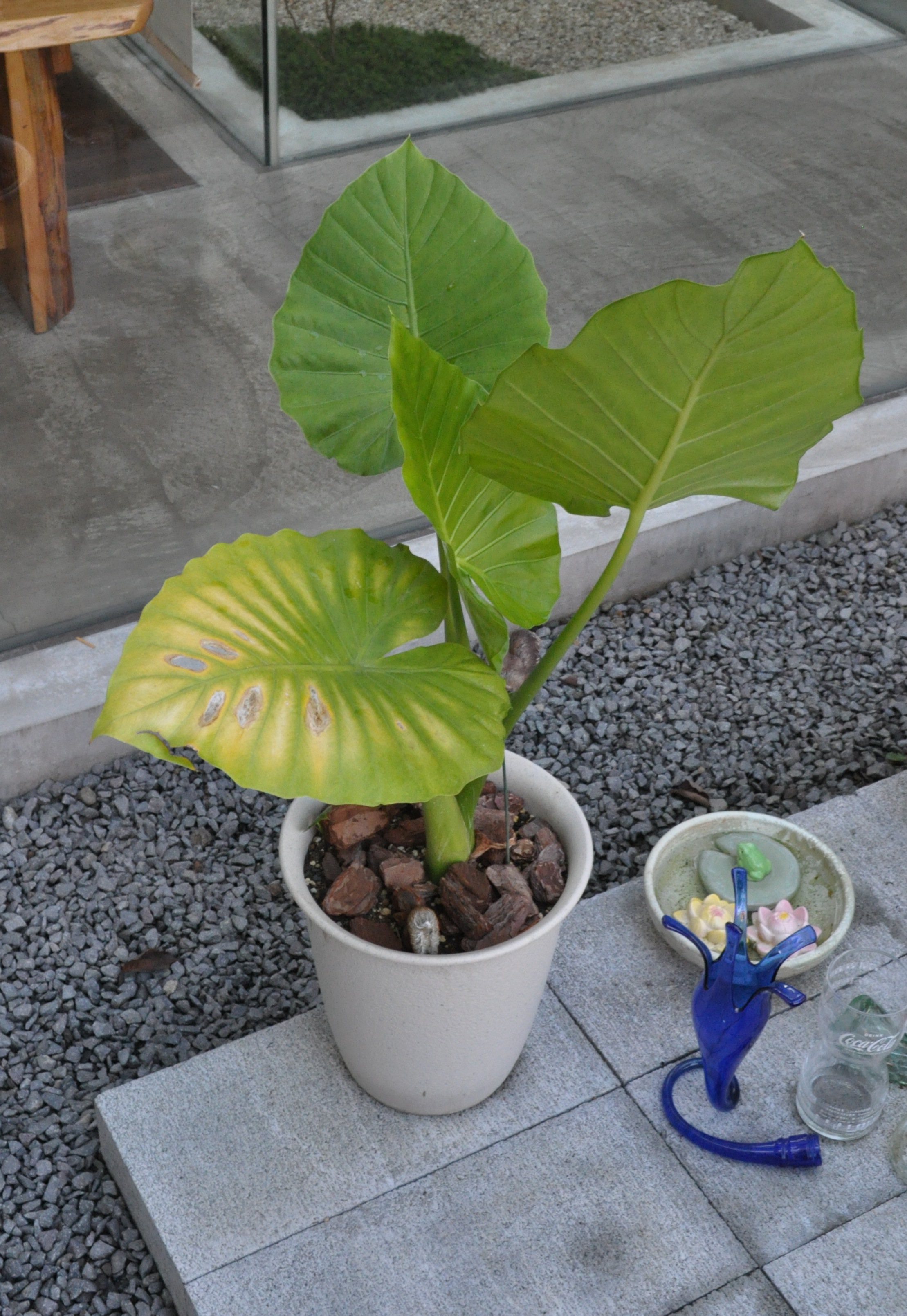 お店の前庭のアートスペースに観葉植物「クワズイモ」が鎮座しております。