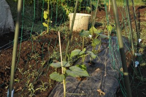 きゅうりの蔓が早くネットに巻き付かないかなあ、サニーレタスの葉っぱがもっと大きくならないかなあと