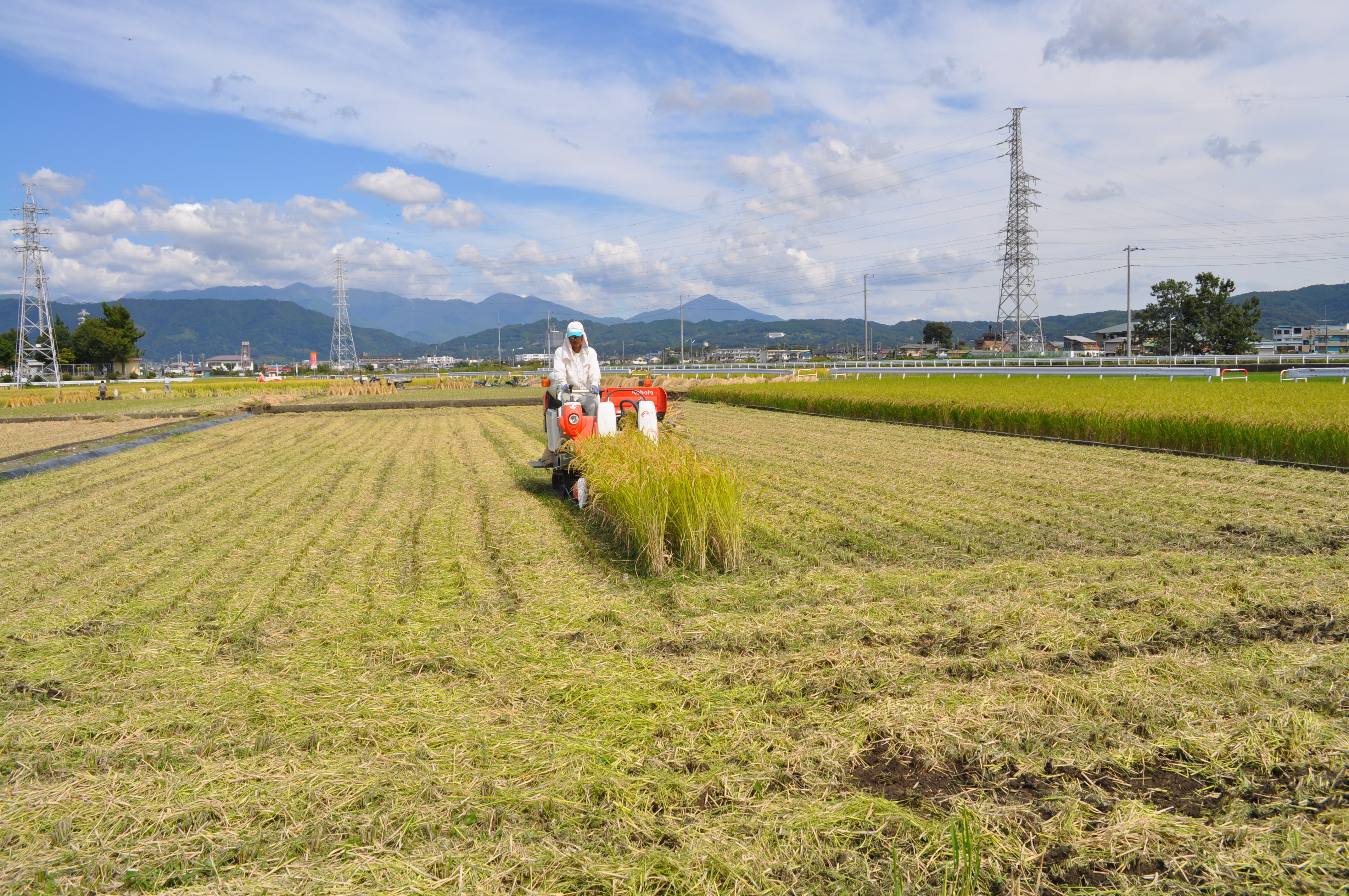 2時間も経たないうちに黄金色だった田んぼには、刈り取られた稲穂の切り株が線上に並びました。