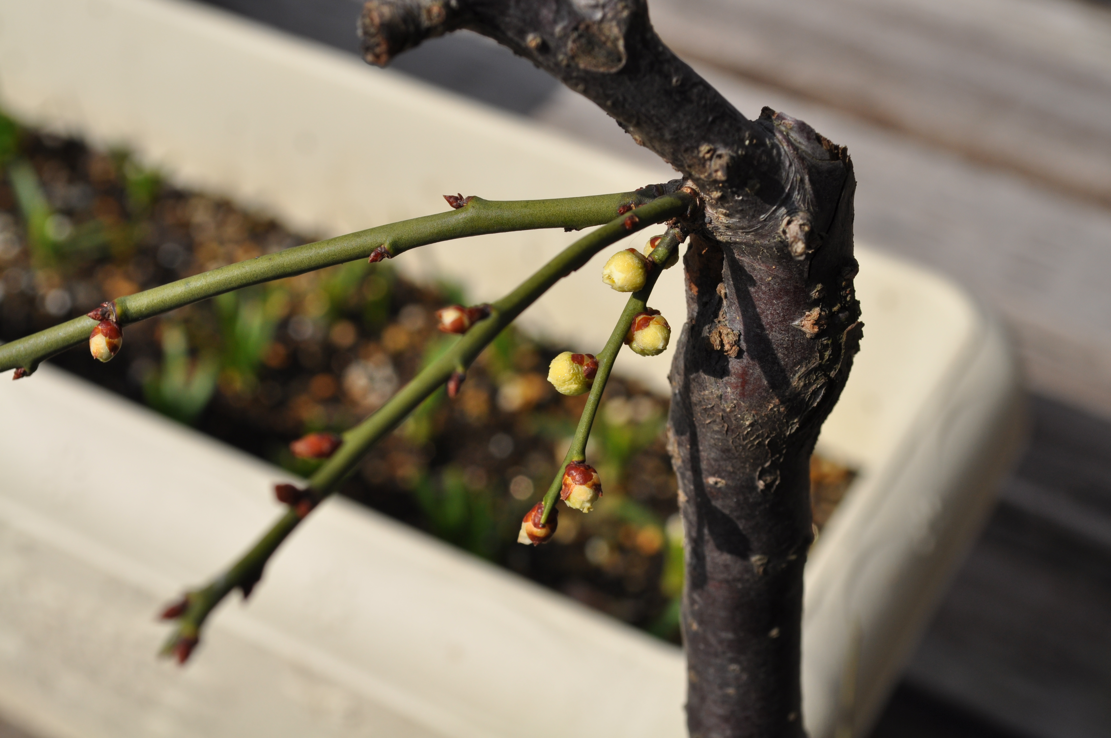 (薄黄色の花が咲く)しだれ梅に