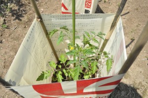 肥料の空き袋を使って風除けを