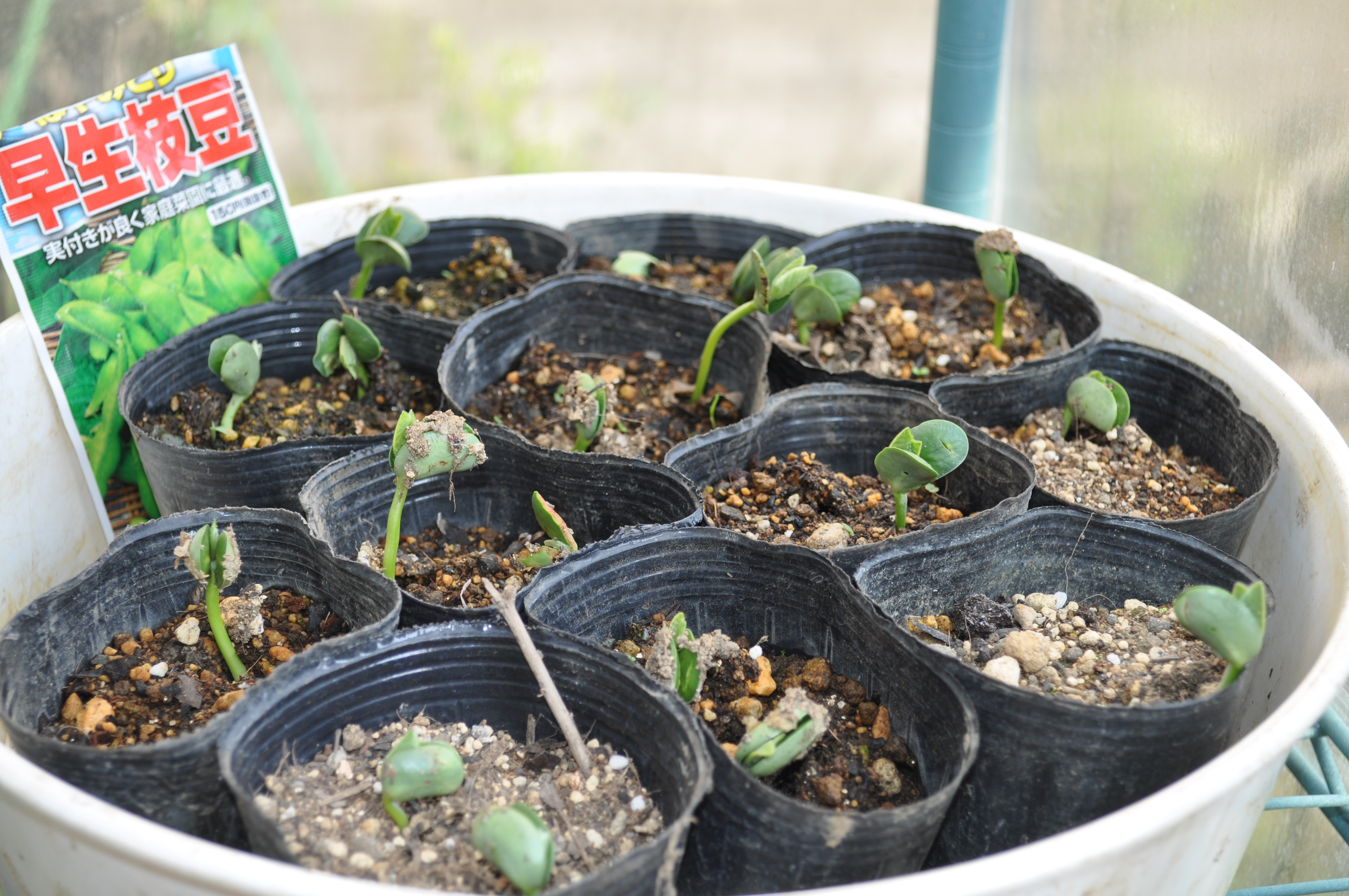 枝豆は、本葉が数枚になったら、かくれんぼ農園に移植する予定です。(次の定休日のお仕事かな?)