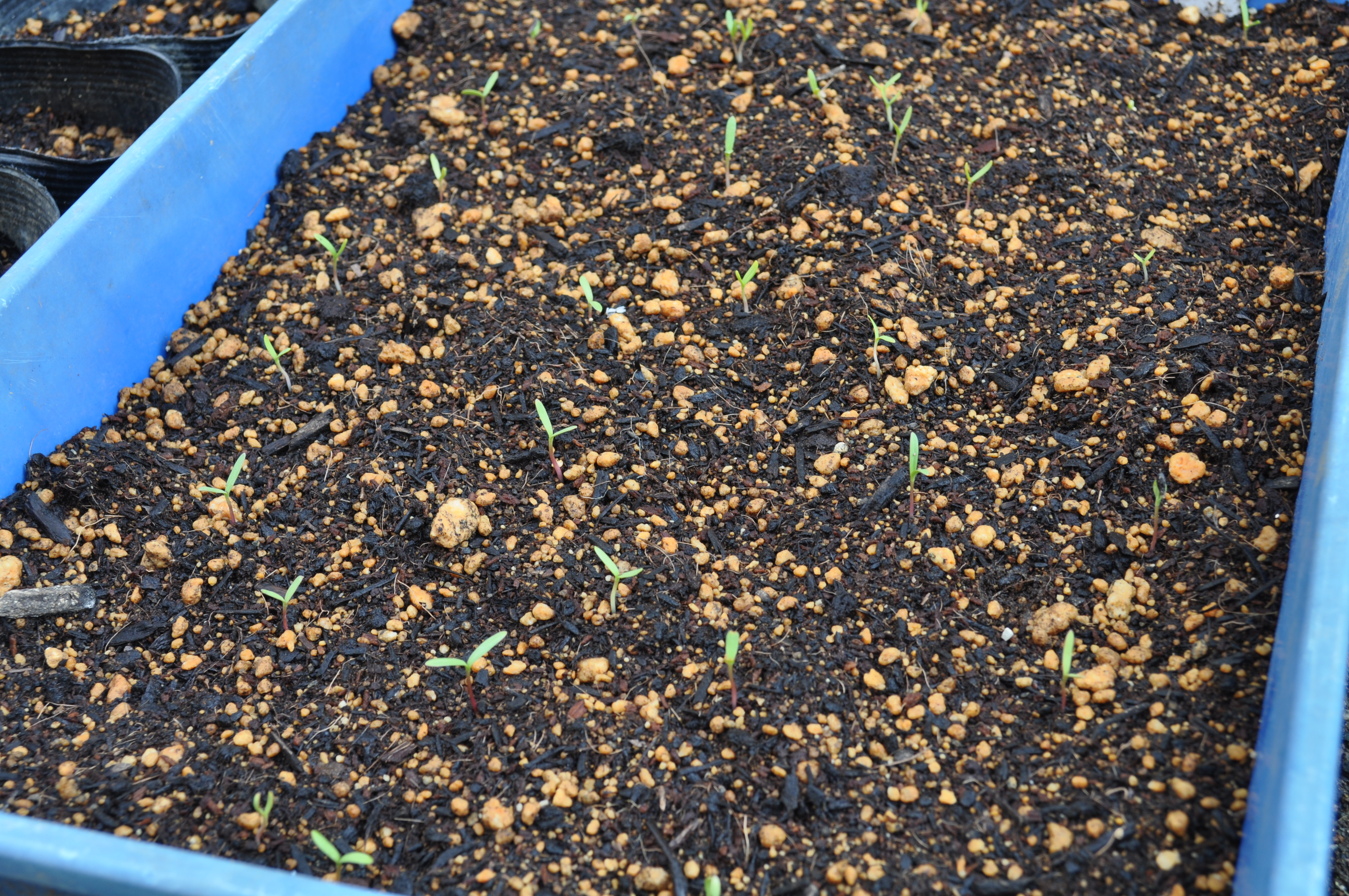 コスモスは、当分この苗床で陽をいっぱい浴びさせ、仲間をもう少し増やしてからポット植えにします。