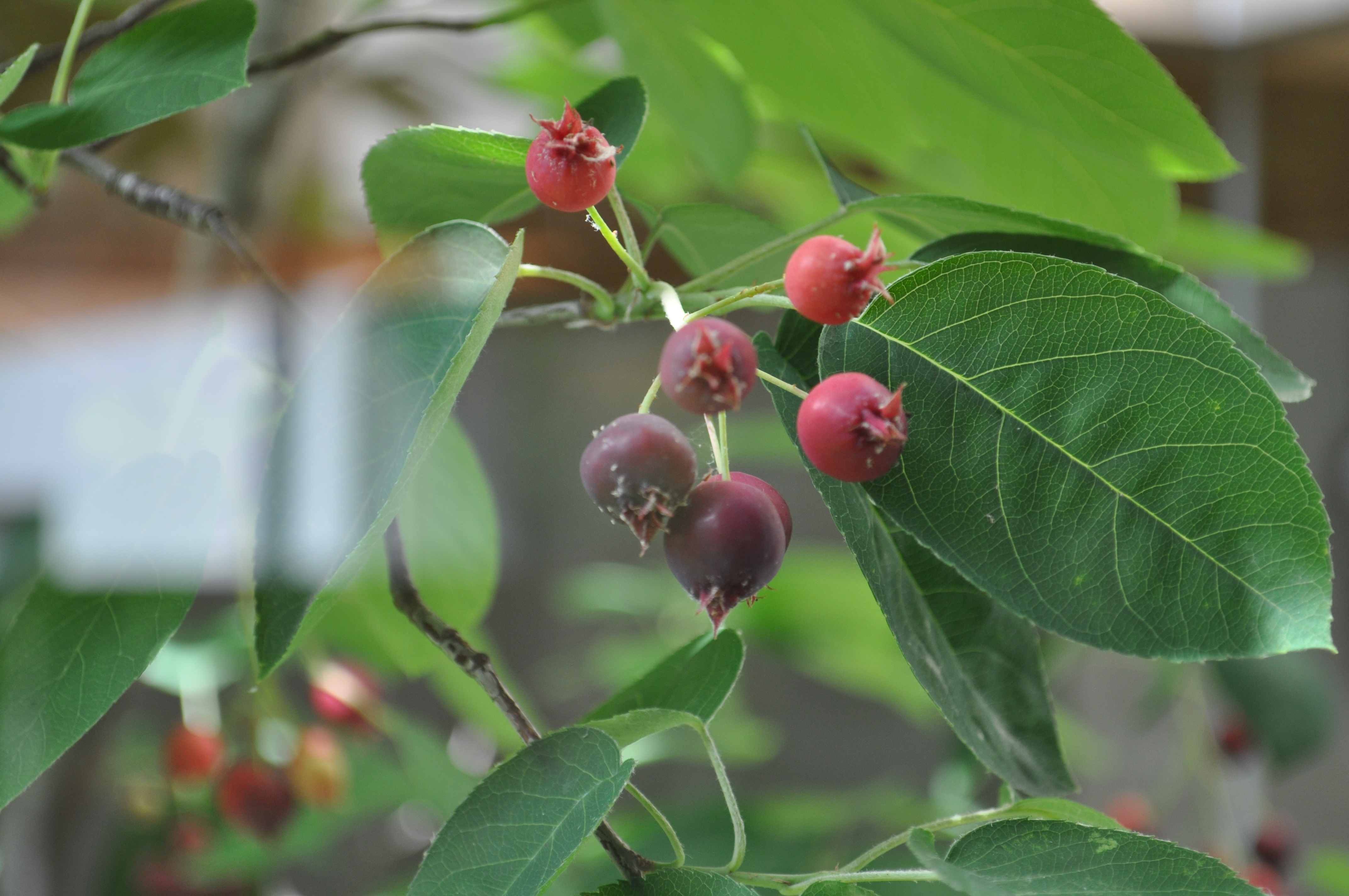 赤い実と新緑の葉のコントラストで