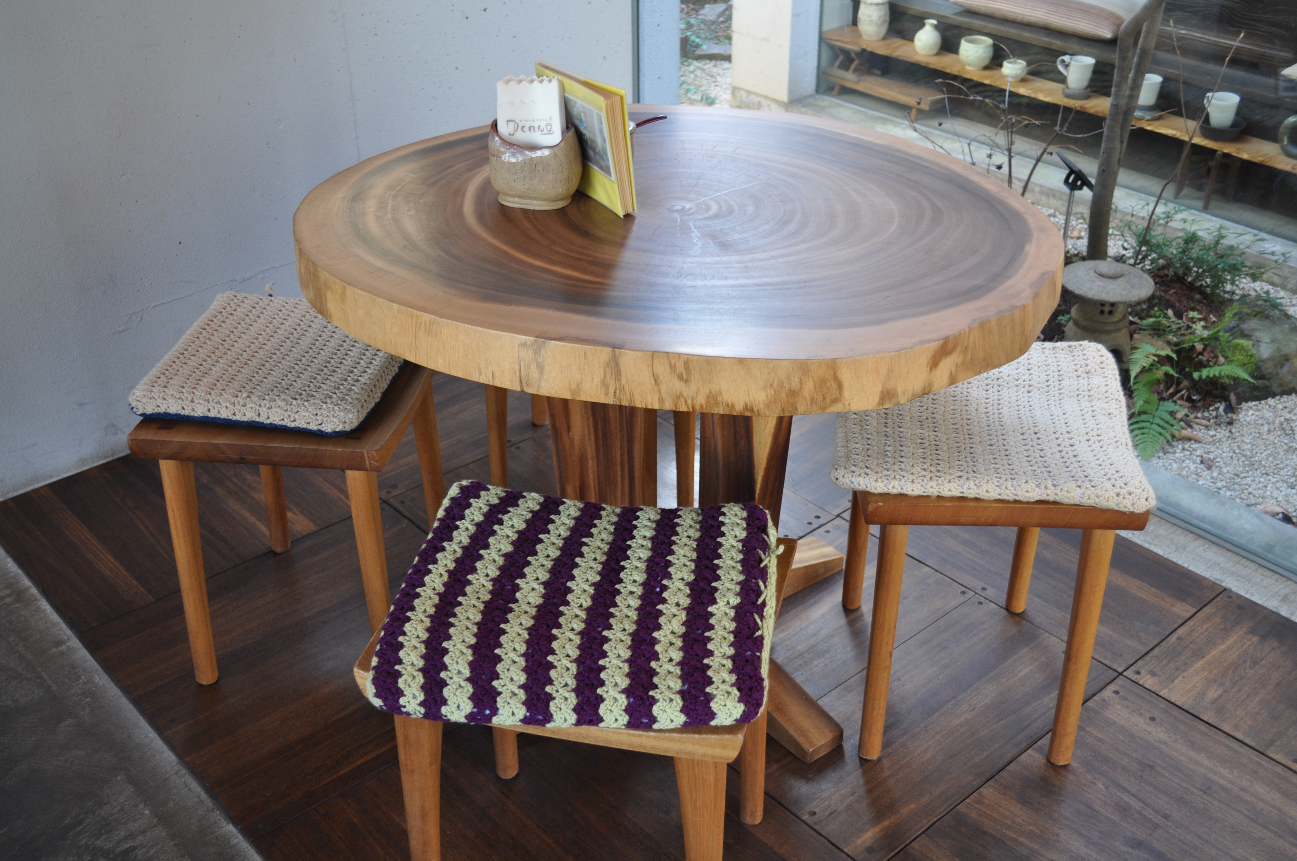木製のいすの上に毛糸で編まれた座布団。