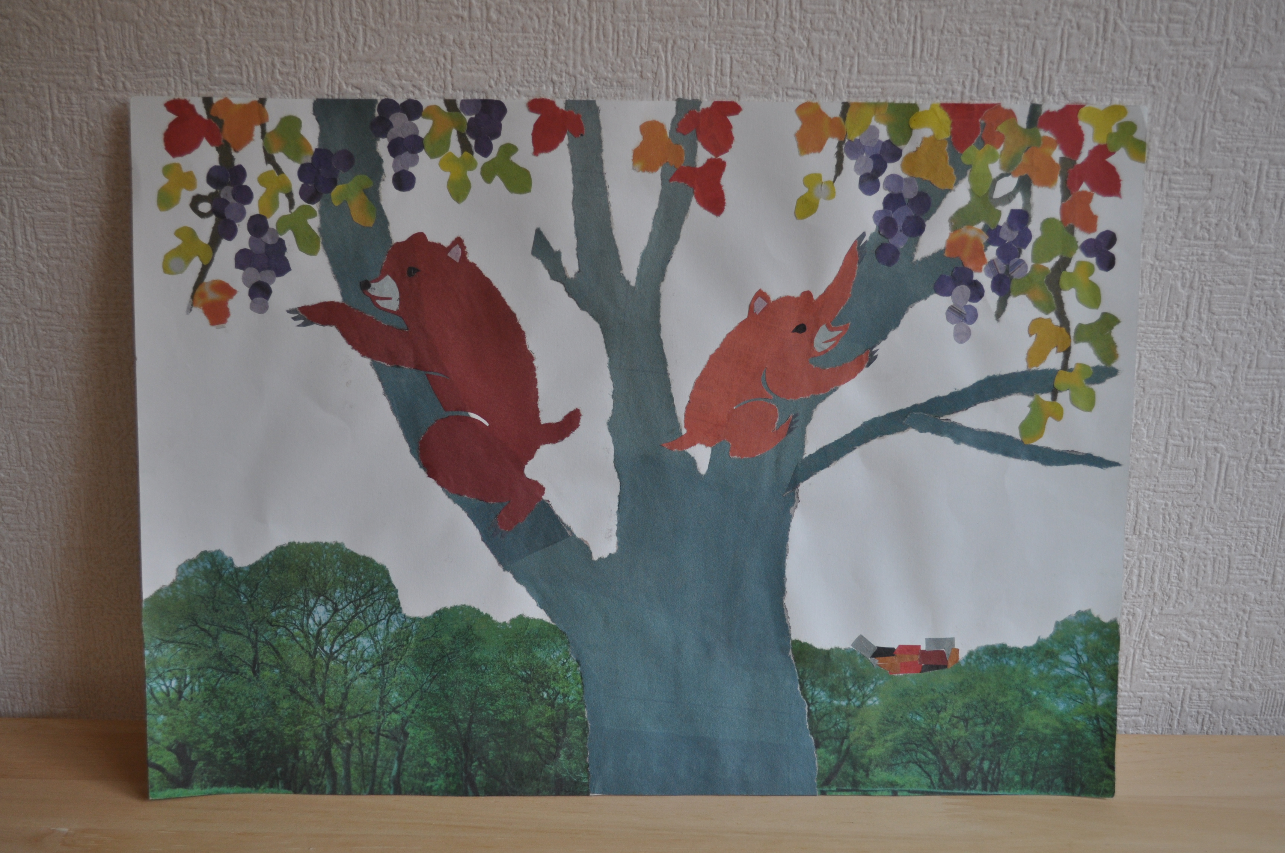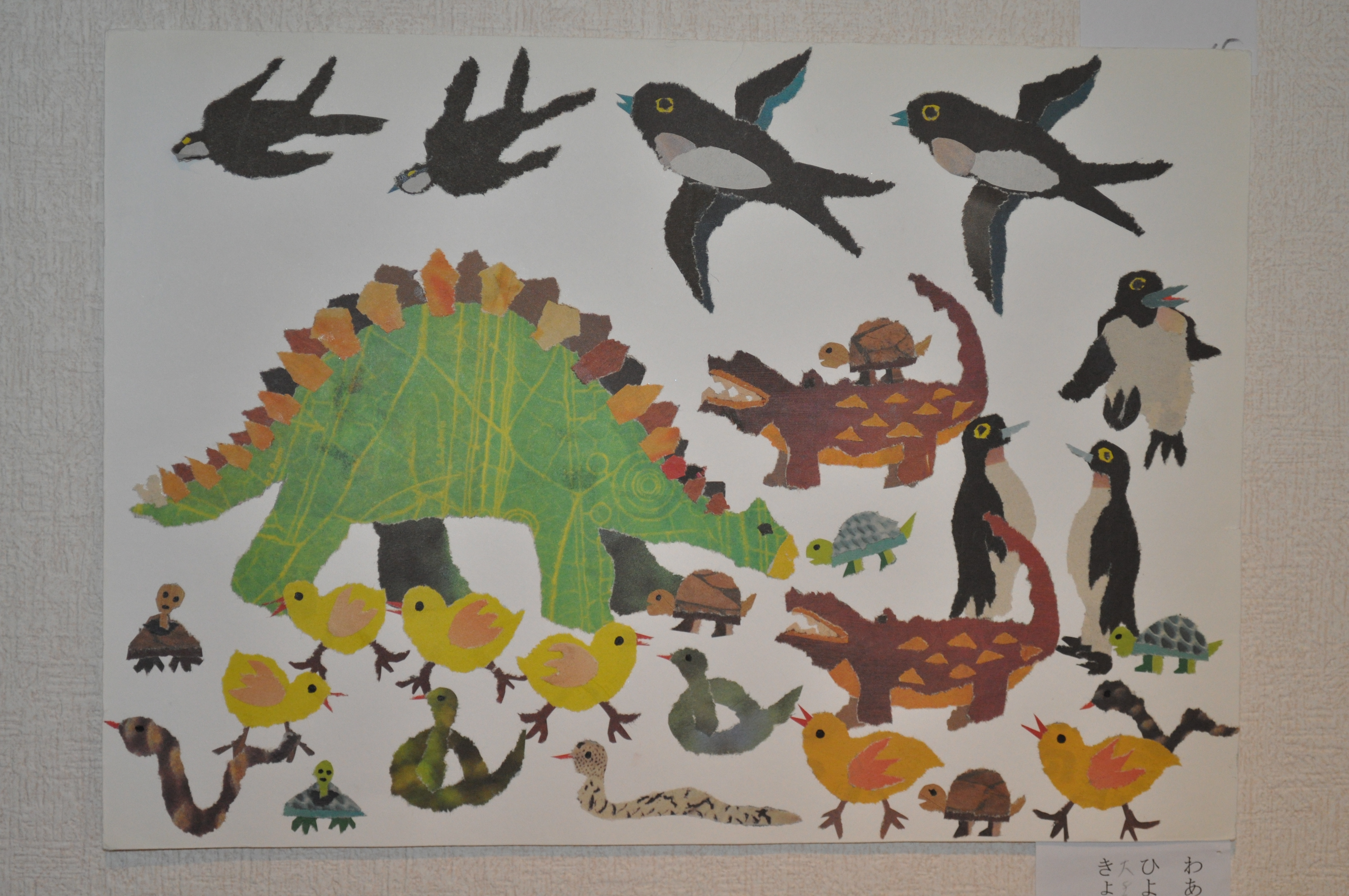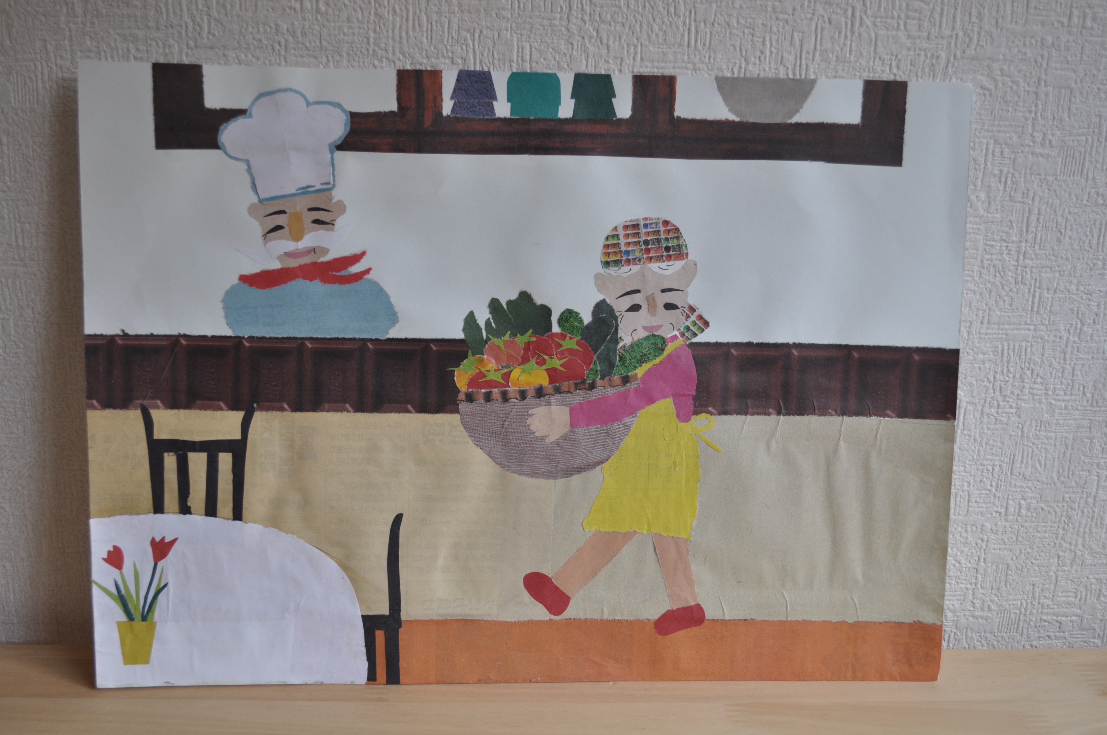 新聞紙のカラー刷りページをストックしておいて、図案に合わせてちぎっては貼り付けていくのだそうです。