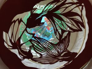 【今回の目玉作品は、「立体切り絵」といって、折り紙と切り絵を融合させた折り鶴です。「日常生活に溶け込む折り鶴」ということで、様々な生活関連グッズに折り紙を添えた作品コーナーも設けた】とのこと。