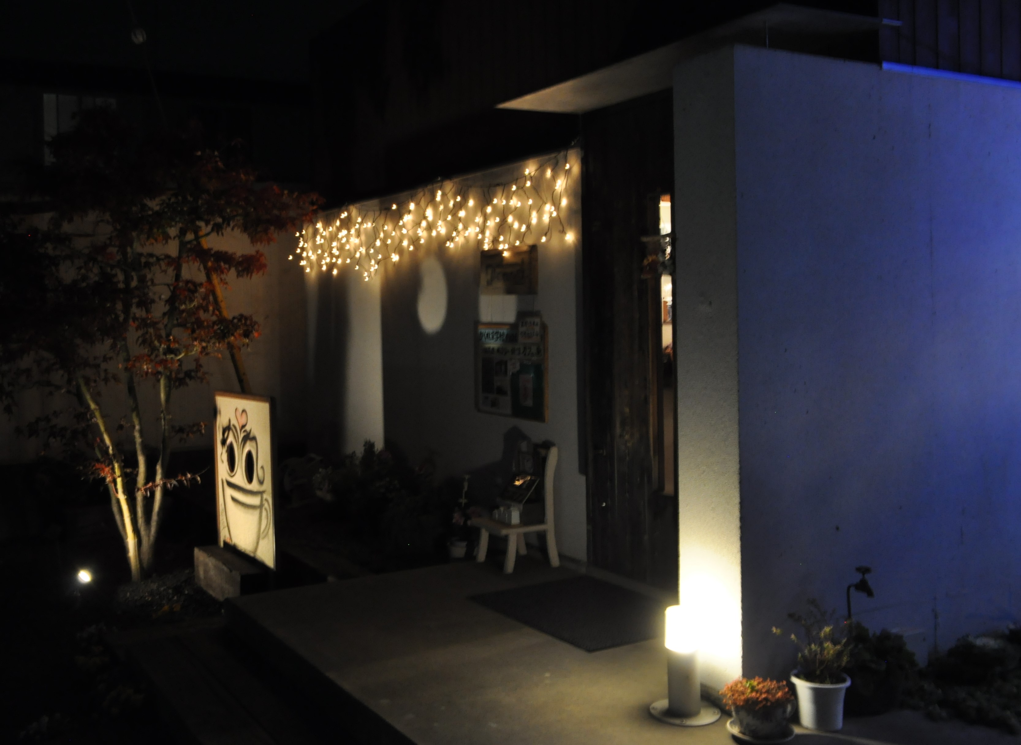 今年初登場の看板上部のイルミネーションは、お客様から譲り受けたもの。