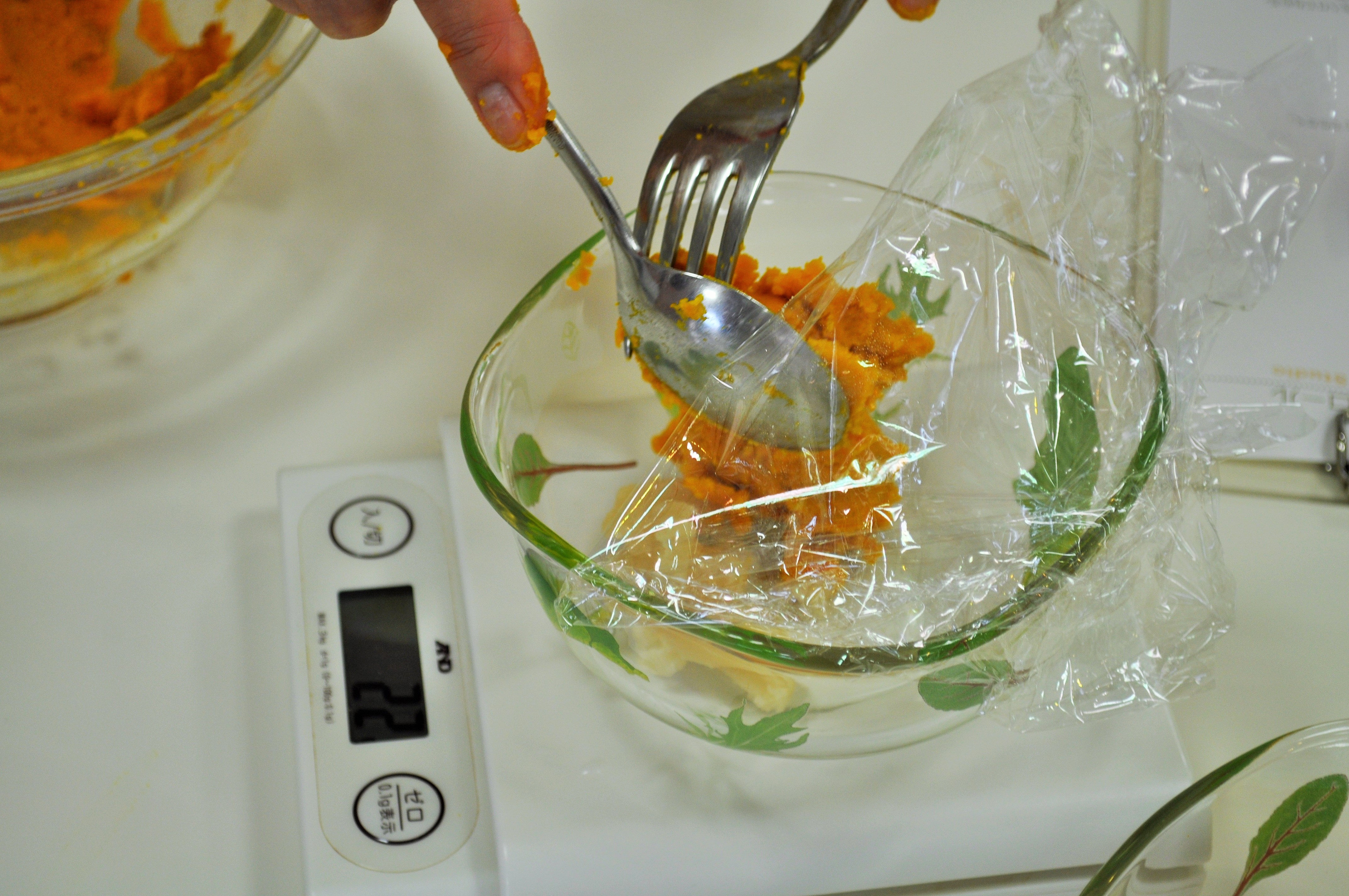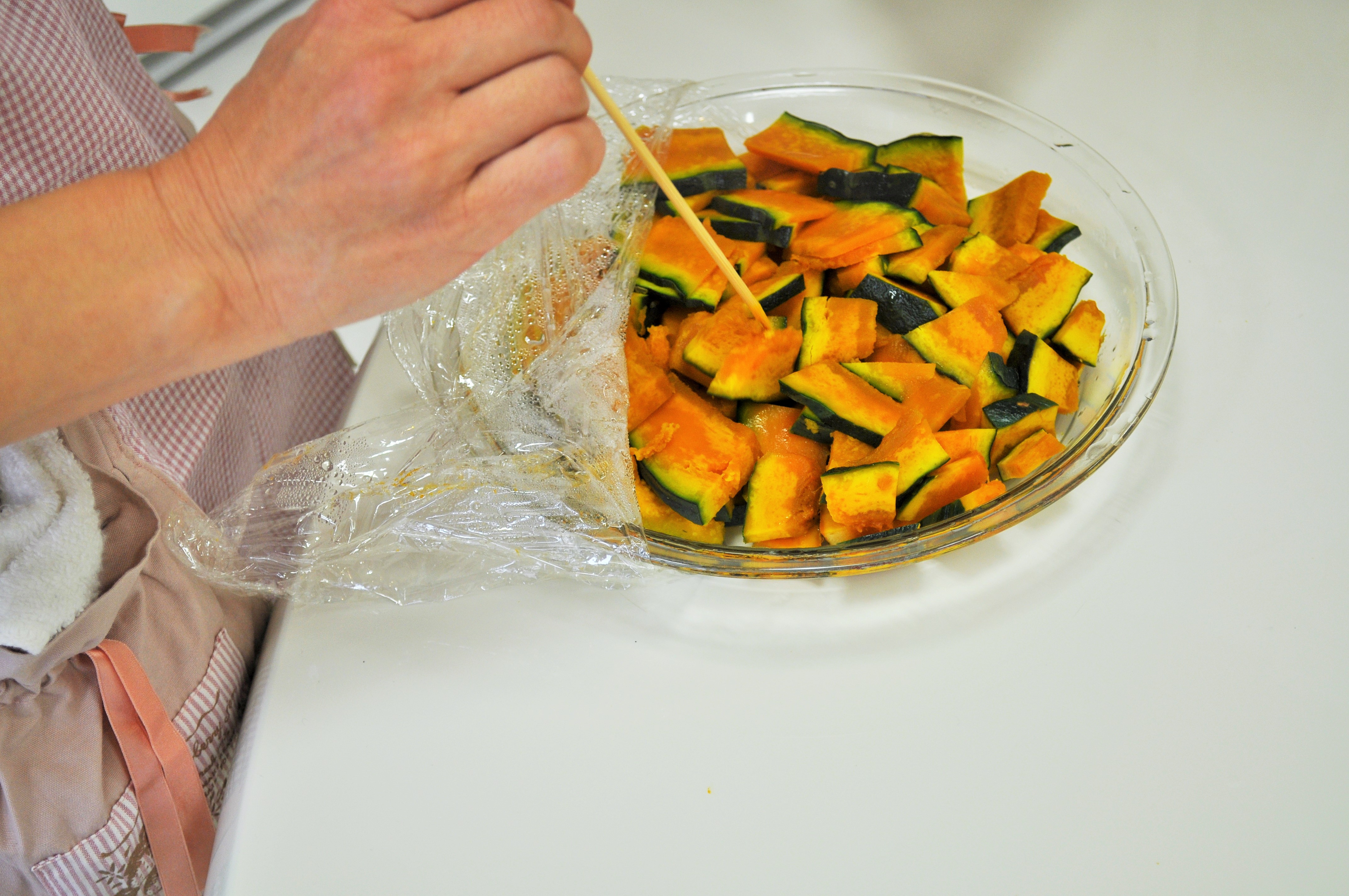 かぼちゃ餡は、電子レンジで5分ほど蒸したあと、