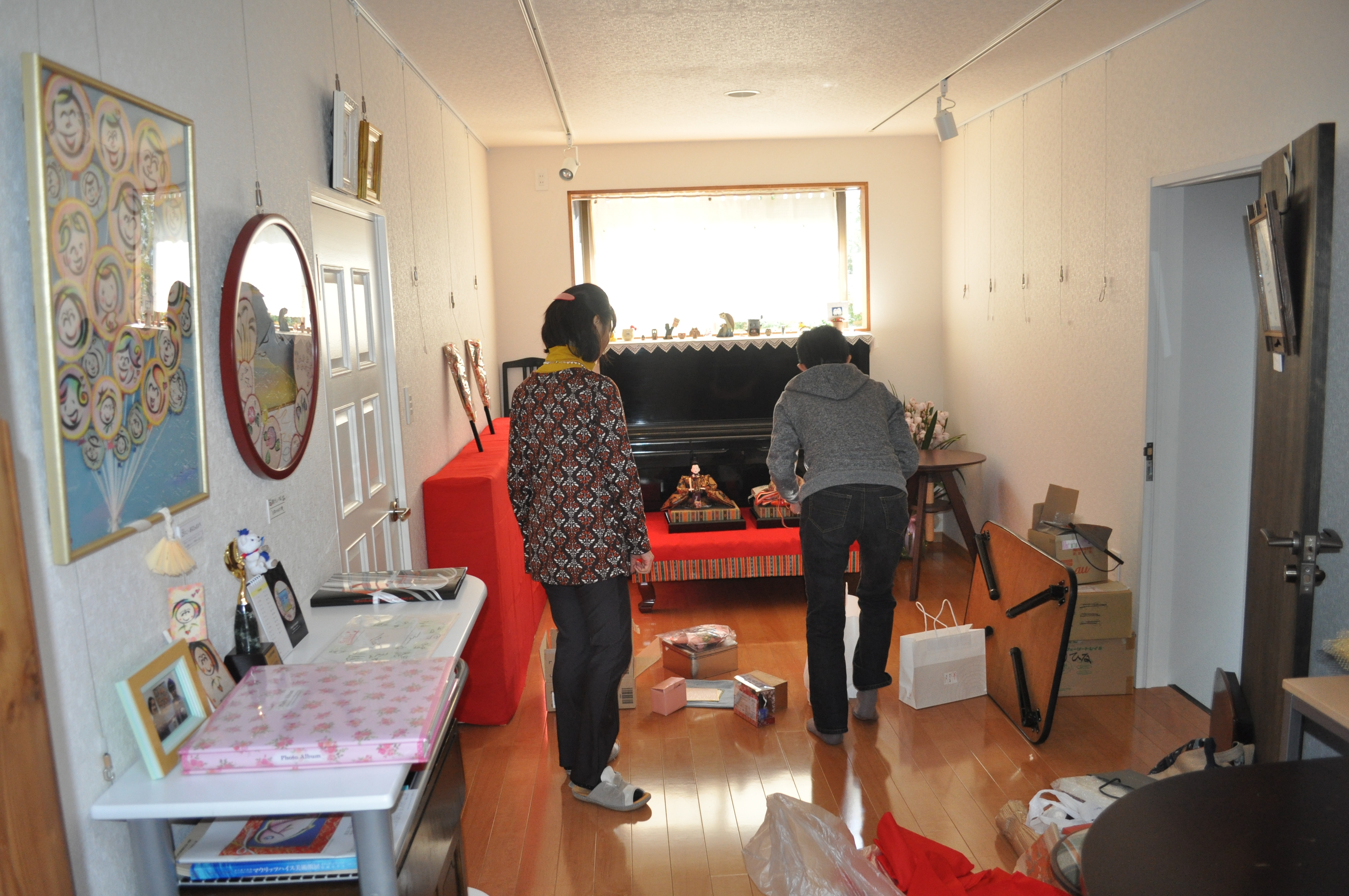 ◎今日の午後、風遊花さんにもお手伝いをいただいて、明日からのイベント『わたしのおひな様展』の