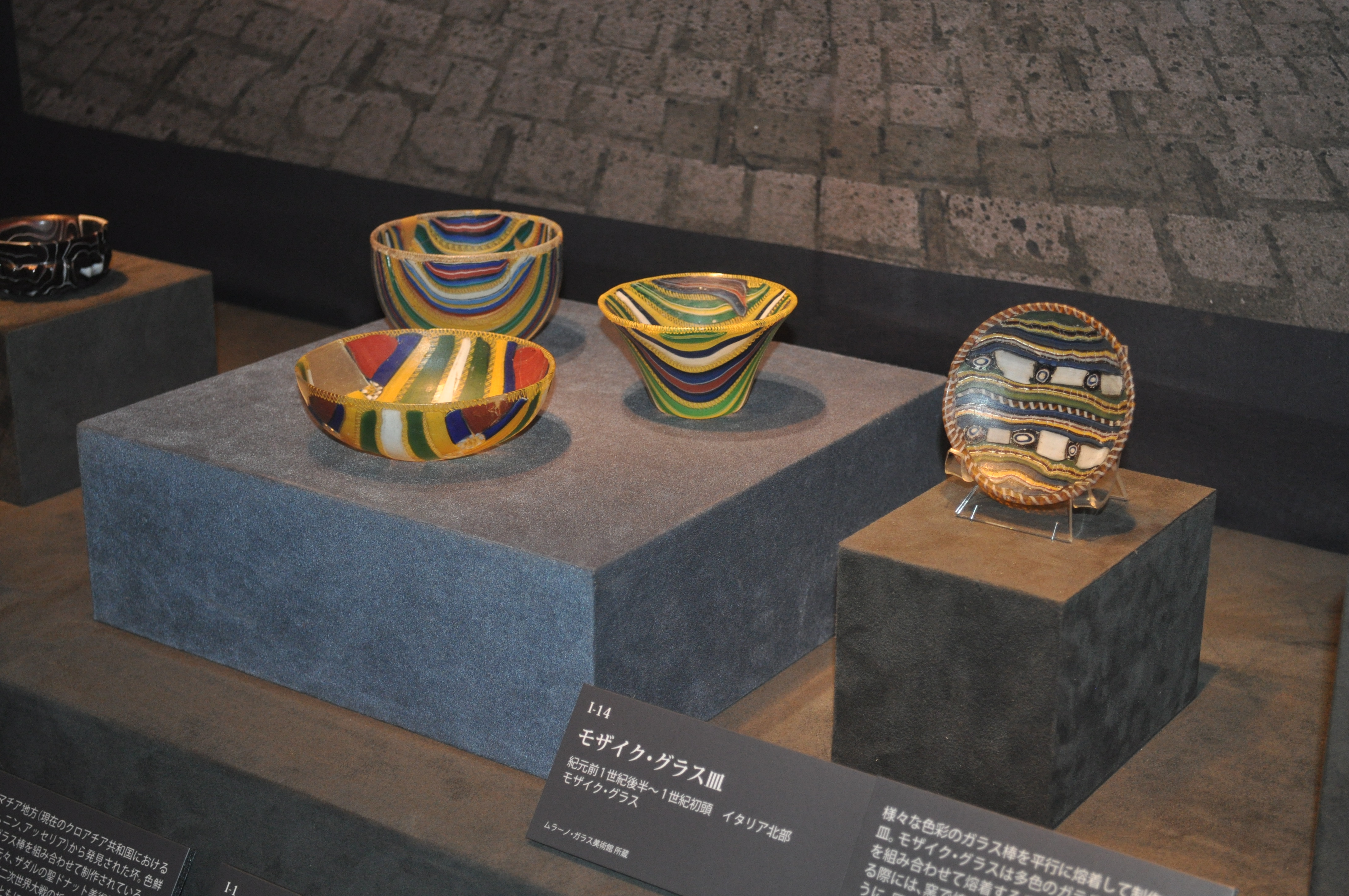 【様々な色ガラスを熔着したモザイク模様のガラス容器が作られるのは紀元前15世紀頃。その後「ローマの平和」を実現する初代ローマ皇帝アウグストゥスの時世(紀元前1世紀頃)になると、高度に発達したモザイク・グラスが作られるようになり、ガラス制作は一つの頂点に達したのです】(企画展HPより抜粋)