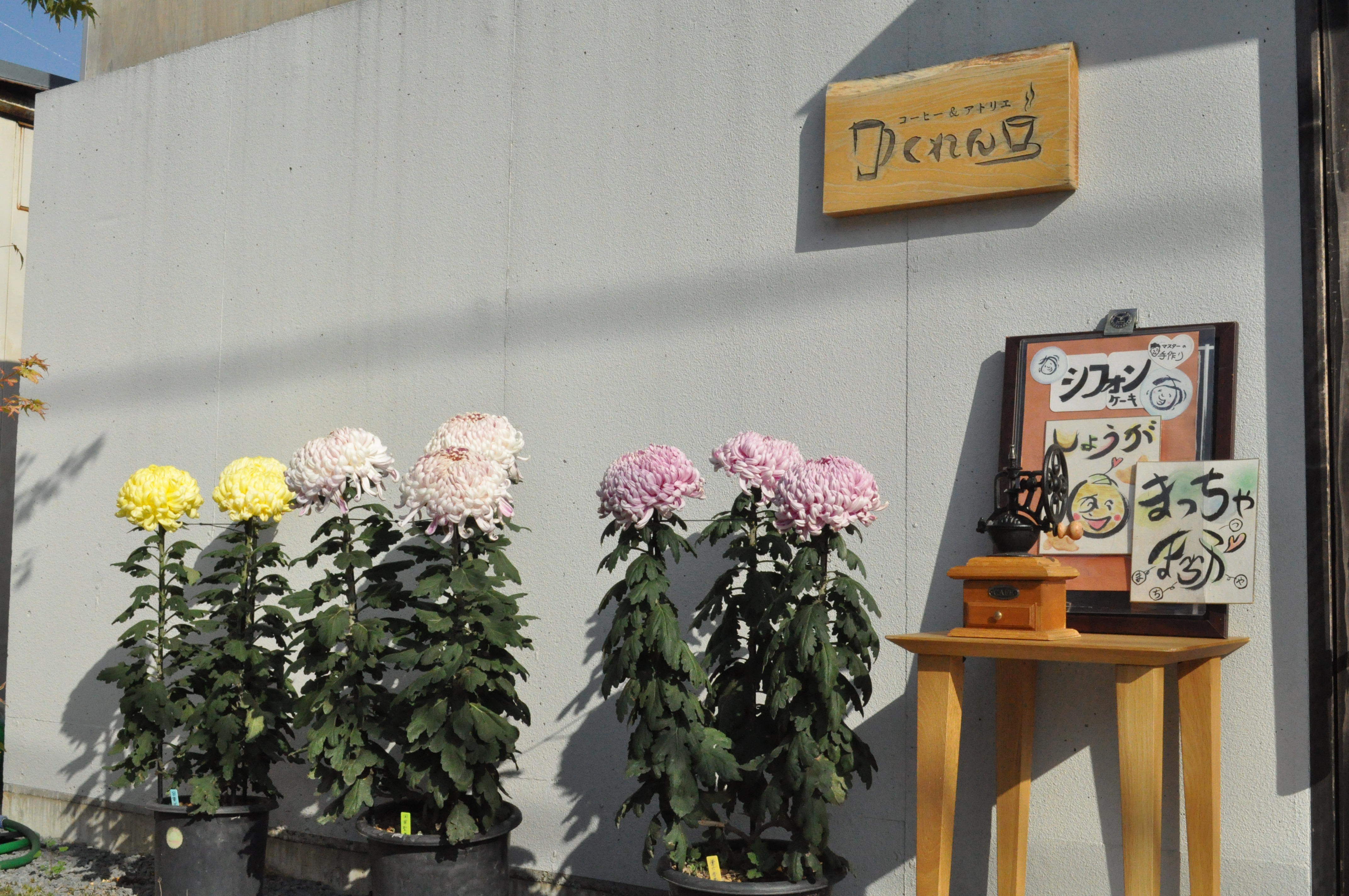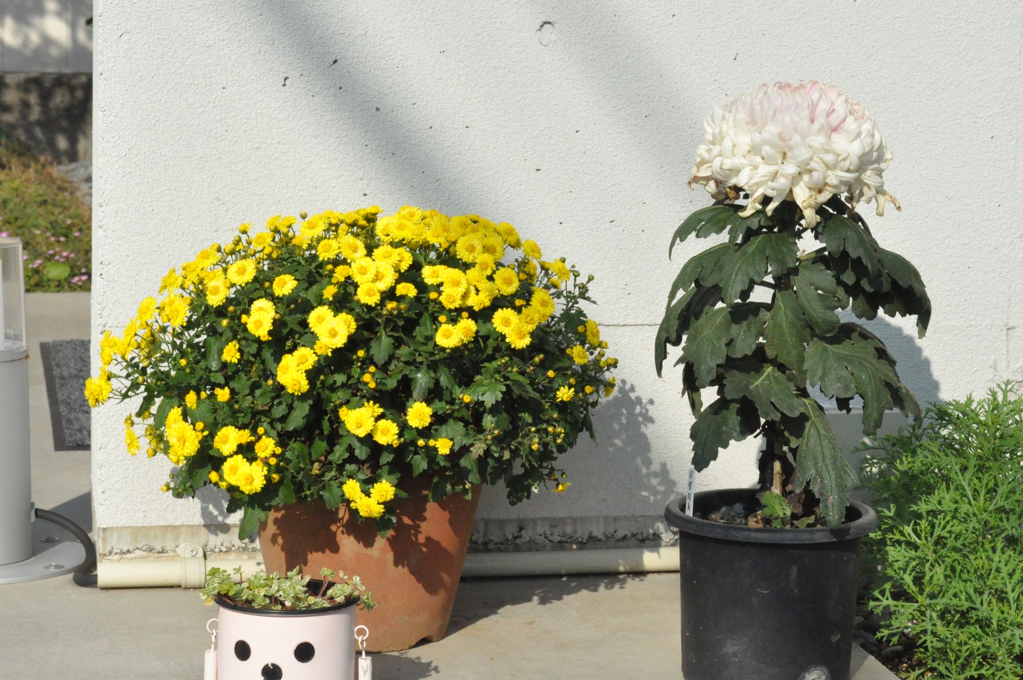 菊の三本仕立てが3種類、かくれんぼの前庭に登場しました。