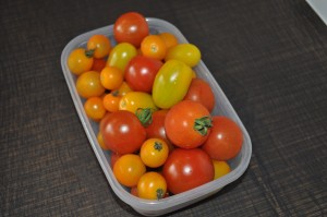 ◎かくれんぼ農園で収穫した無農薬トマト3種類を袋詰めにして、50円でお客様にお分けしております。露地で完熟したトマトくんたちですので、味が濃く、ジューシーです。ぜひお試しを。