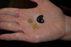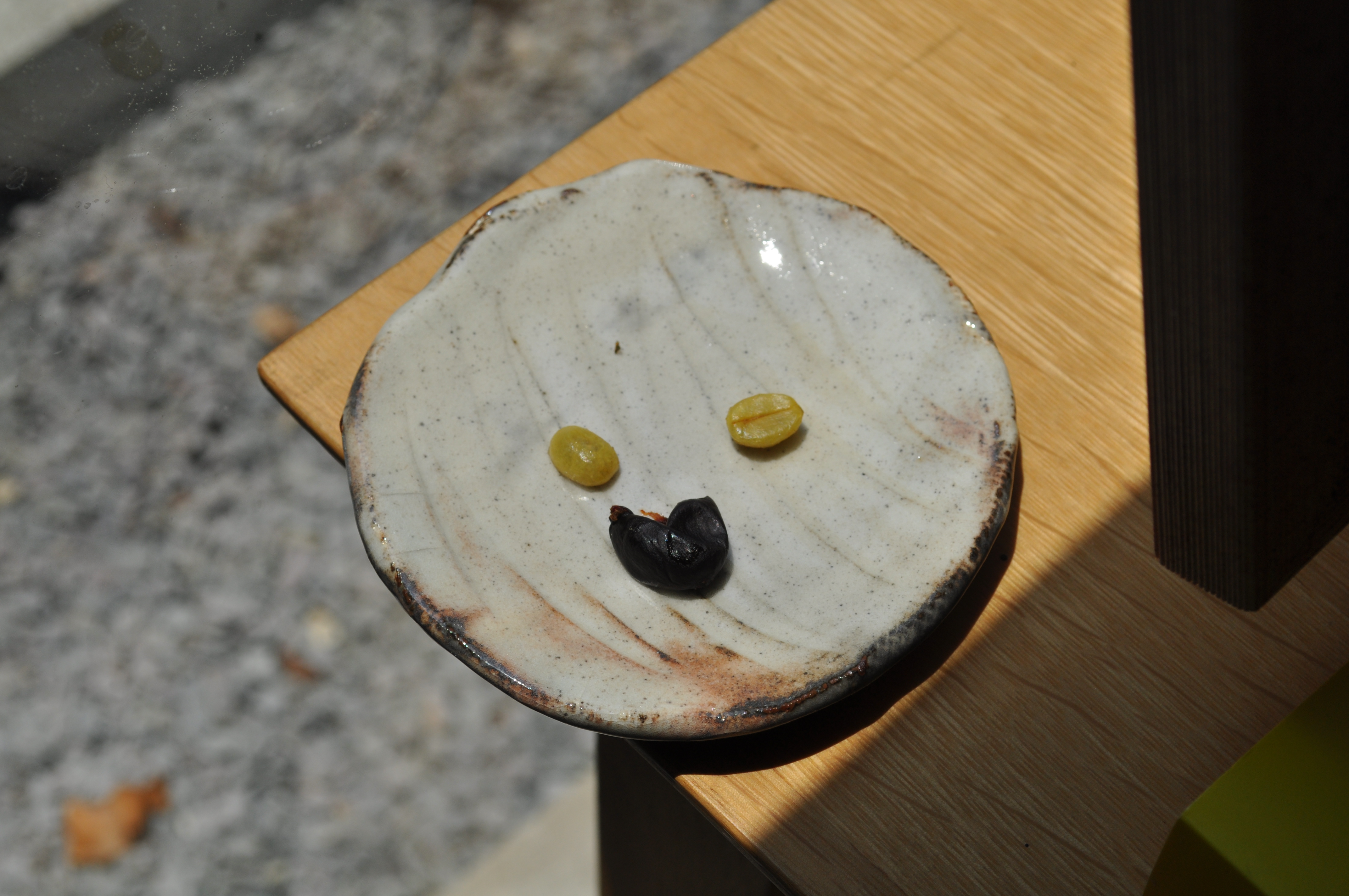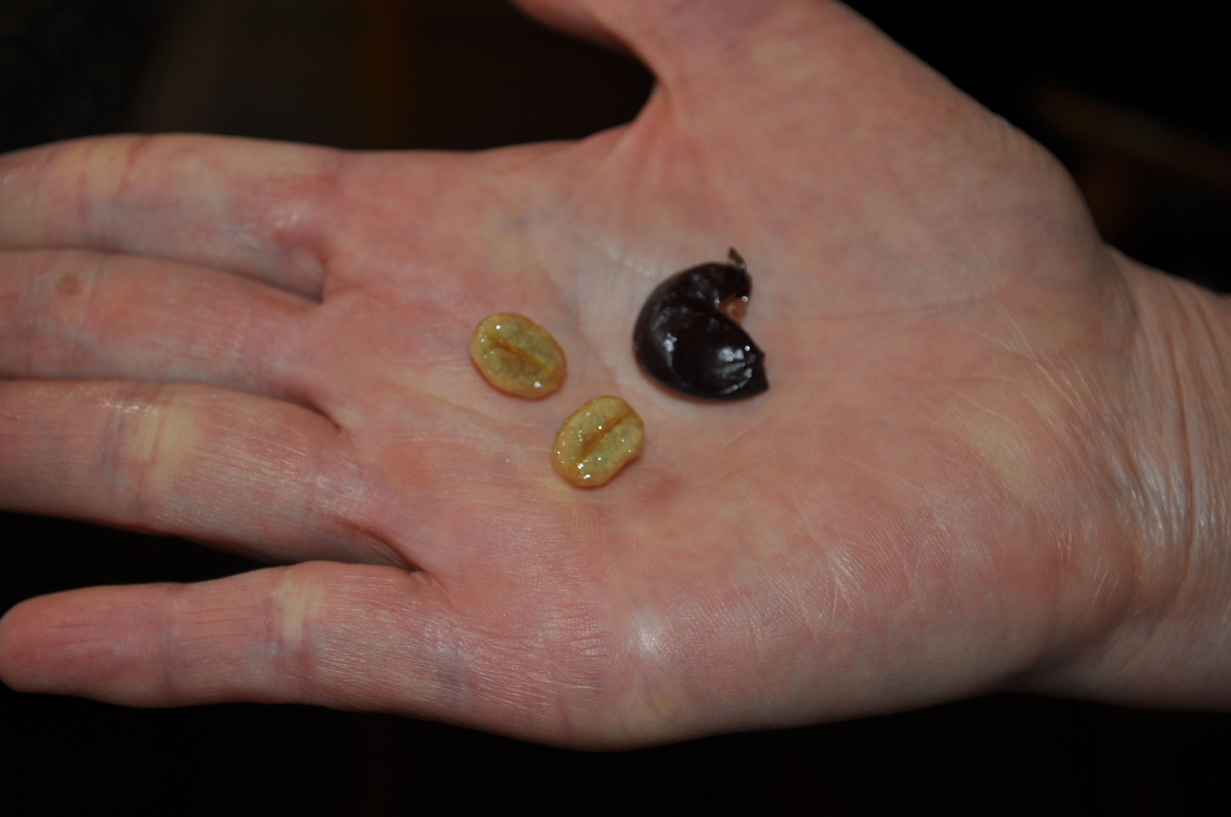 実は完熟だったようで、皮がするりと向けて中から、何と黄白色のコーヒー豆が登場。(ぬるぬるしています)