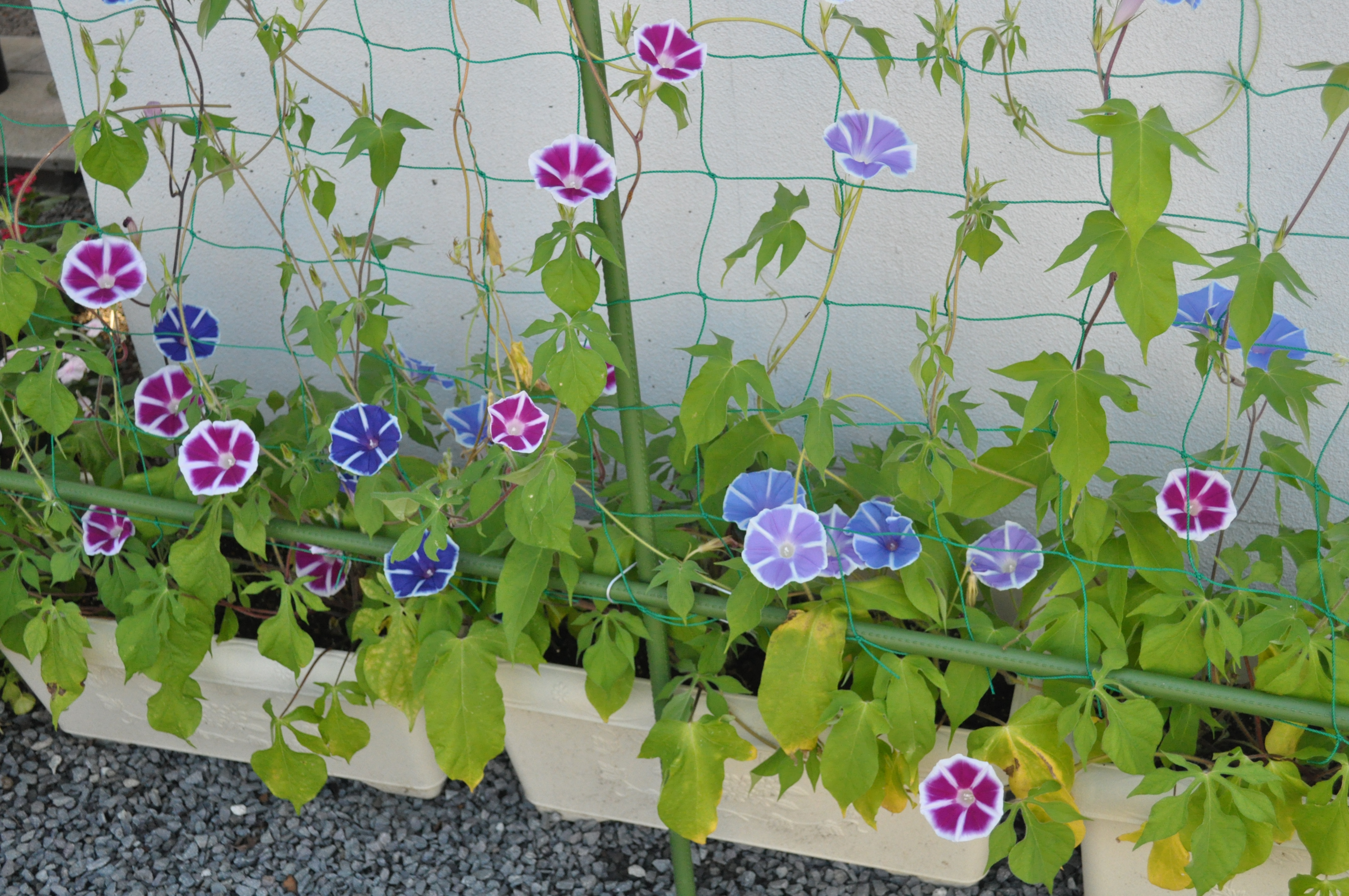 朝顔のつるが上へ横へと、どんどん伸びています。